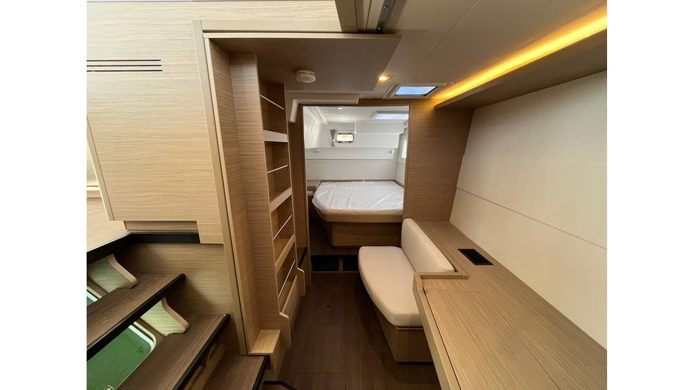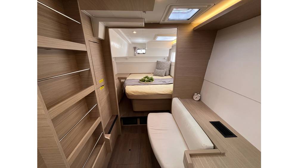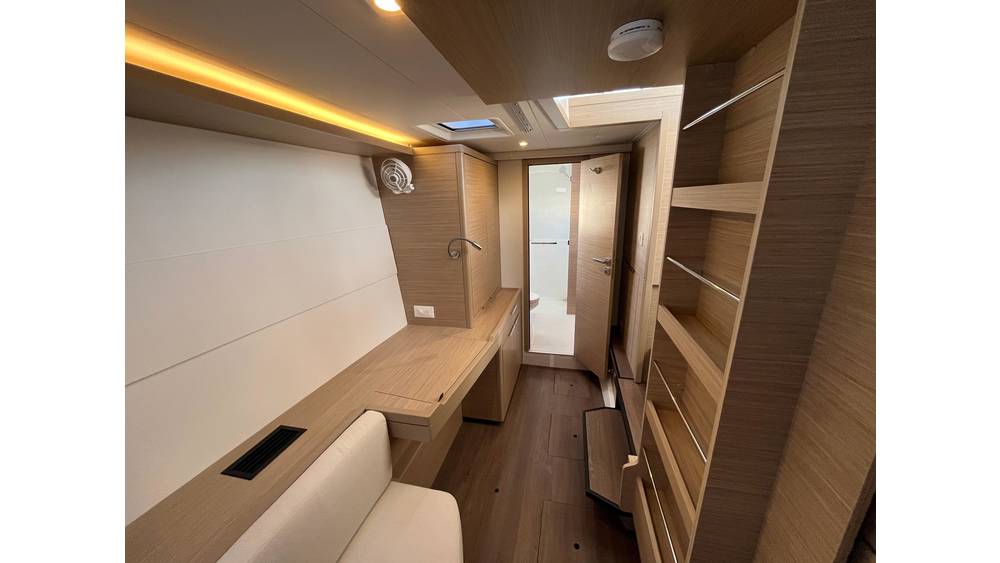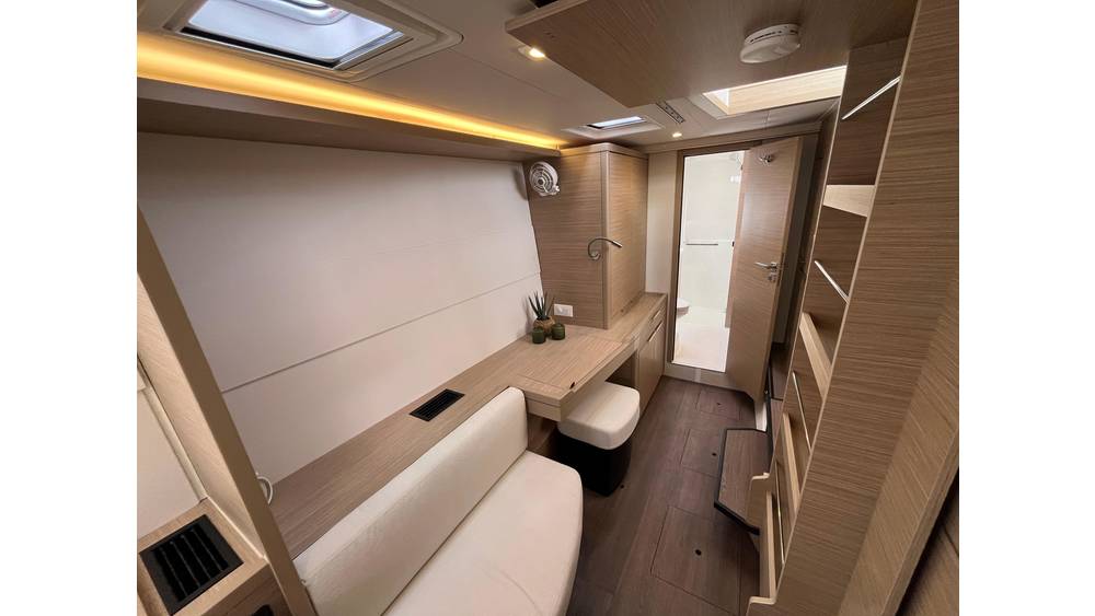 INTERIOR: ELEGANCE AND LUMINOSITY - A selection of luxurious materials, by Nauta Design, enhances the new interior lines. - A wide choice of accommodation layouts to meet the needs of owners and large families: available in three or four cabins. - A new aft cabin, fitted with a « semi Island bed » berth and multiple storage space. - Large hull window glazing with integrated portholes in the cabin provide exceptional natural light and an outstanding view. Particular attention given to volume layout, smooth flow of circulation and luminosity makes this new interior a truly pleasant living area.