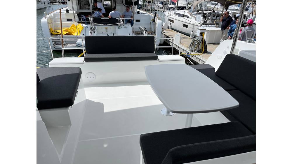 EXTERIOR: SPACE AND COMFORT - A comfortable cockpit looking out to sea: a starboard dining table, able to accommodate up to twelve guests, a recreation area on the same side and seating at the rear beam. - An ergonomic helm station accessible from the cockpit or deck, thus enabling communication between the skipper and crew at all times. - Large aft transoms with a spacious swim platform, allowing simple access to the tender and safe, easy boarding. - A forward cockpit, fitted with a sunbathing area, provides further living space.