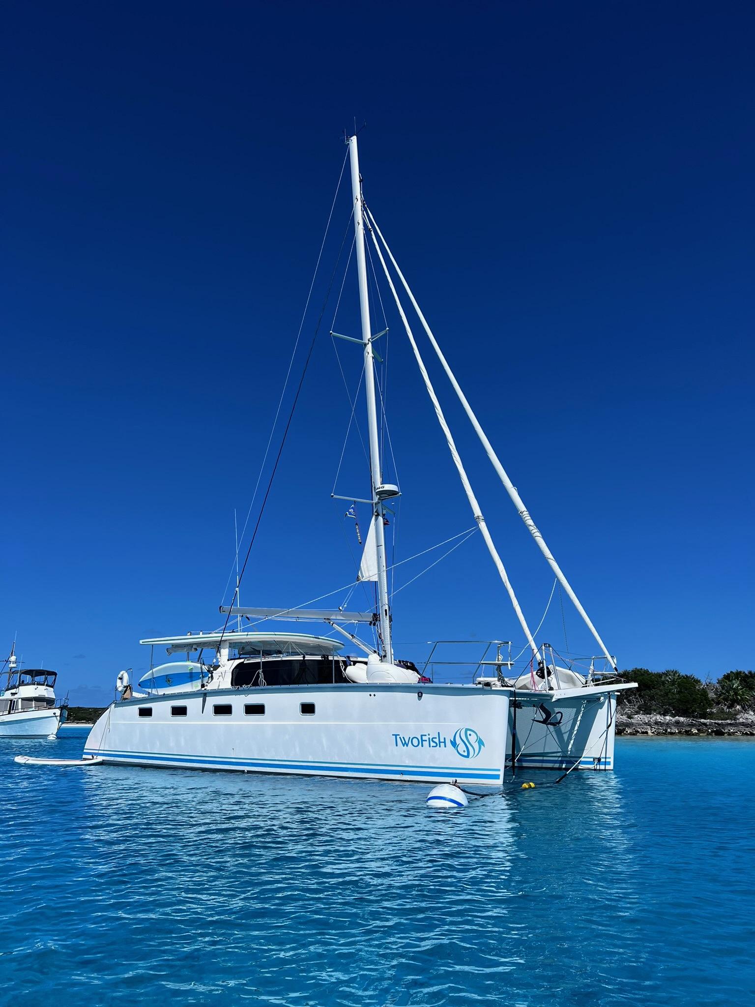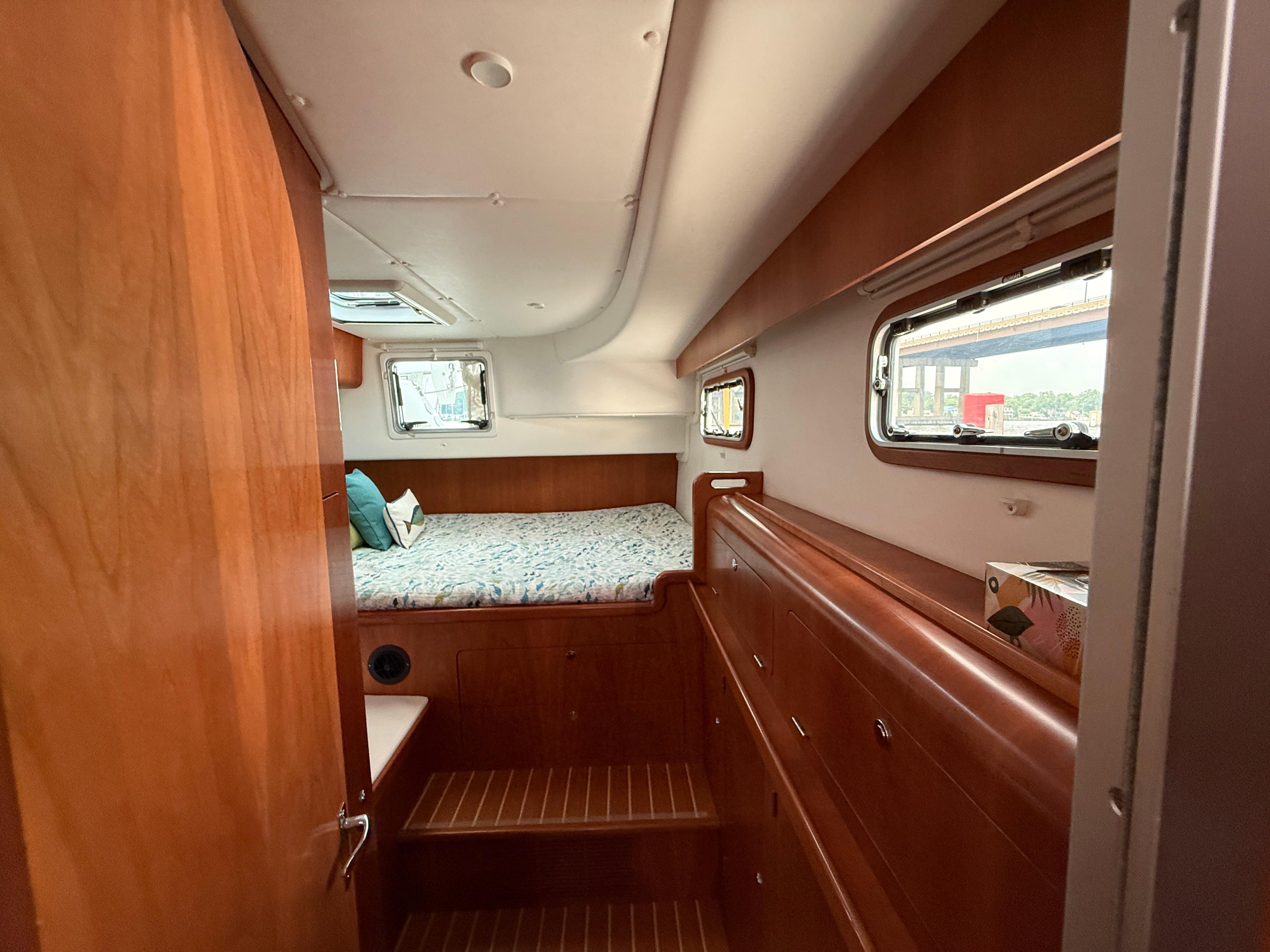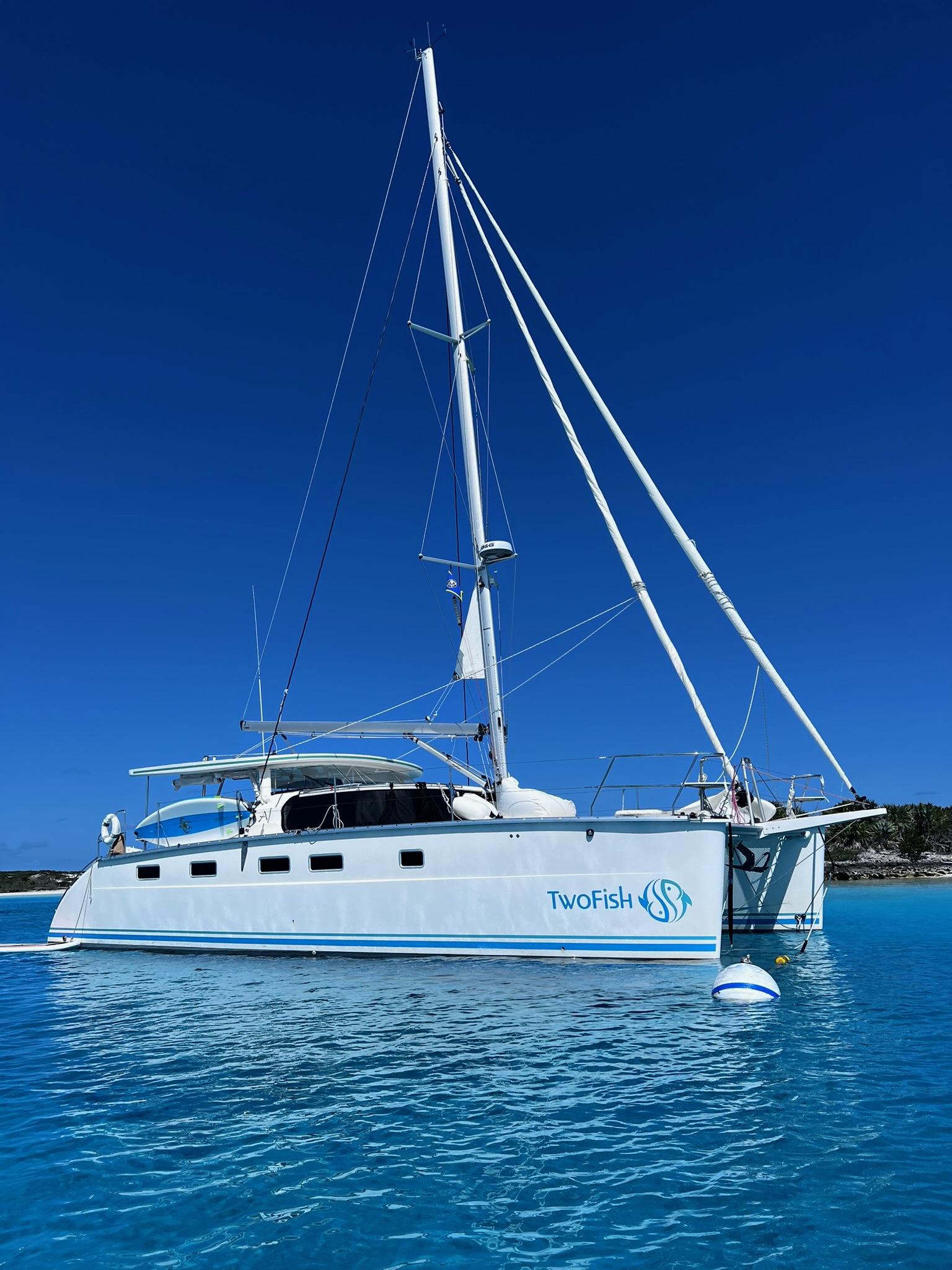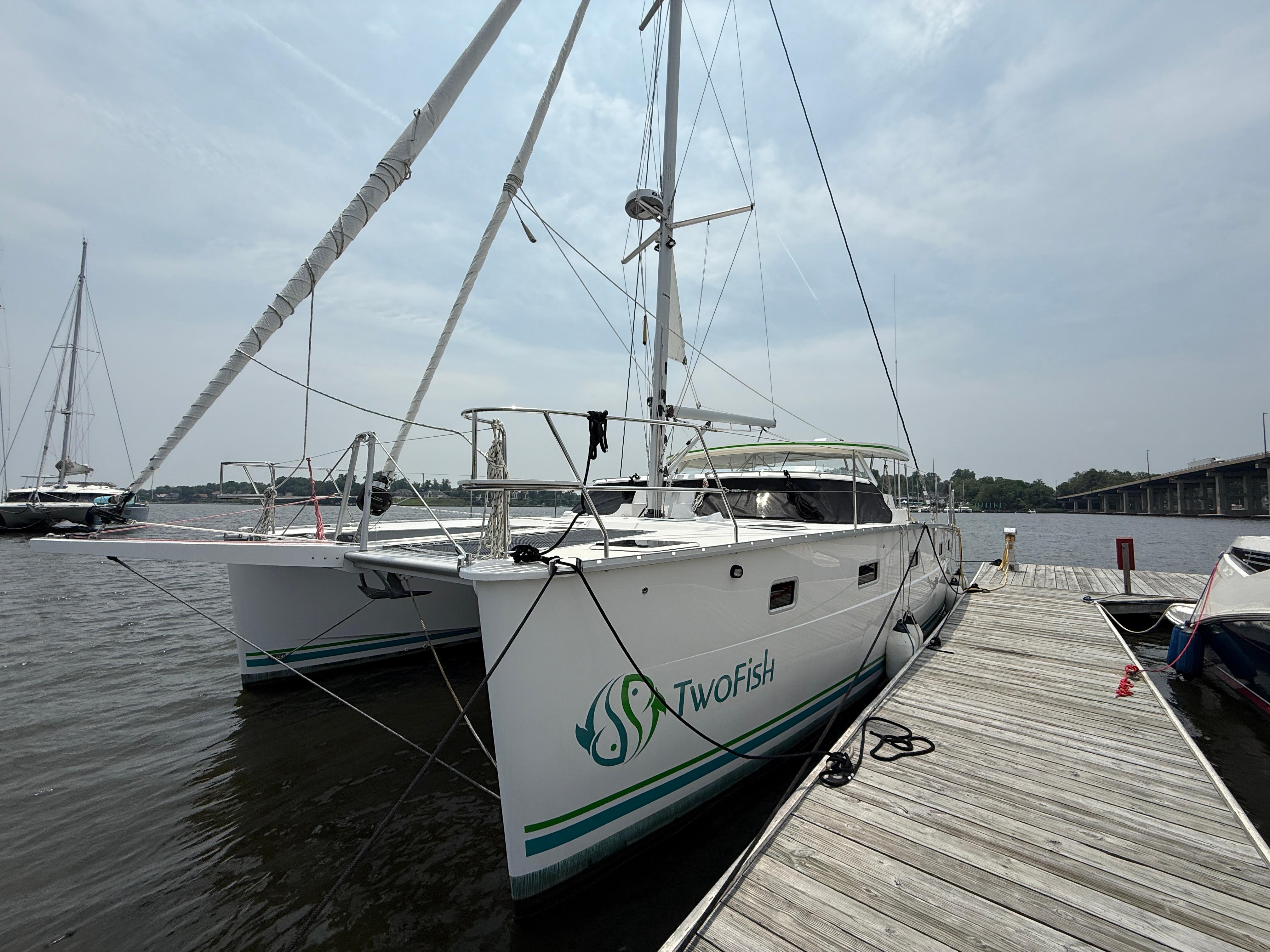 Antares catamarans are built in Argentina and designed with a very different approach from most builders. They offer shaft drive with an easy access to each engine amidship. Antares are built for comfort, safety and performance with a fully enclosed cockpit and a protected helm. Two-Fish offers an in-mast furling mainsail, a 130% genoa and furling screecher and an asymmetrical spinnaker. She is perfect for family cruising or for a short handed crew. The interior woodwork is high quality cherry wood.