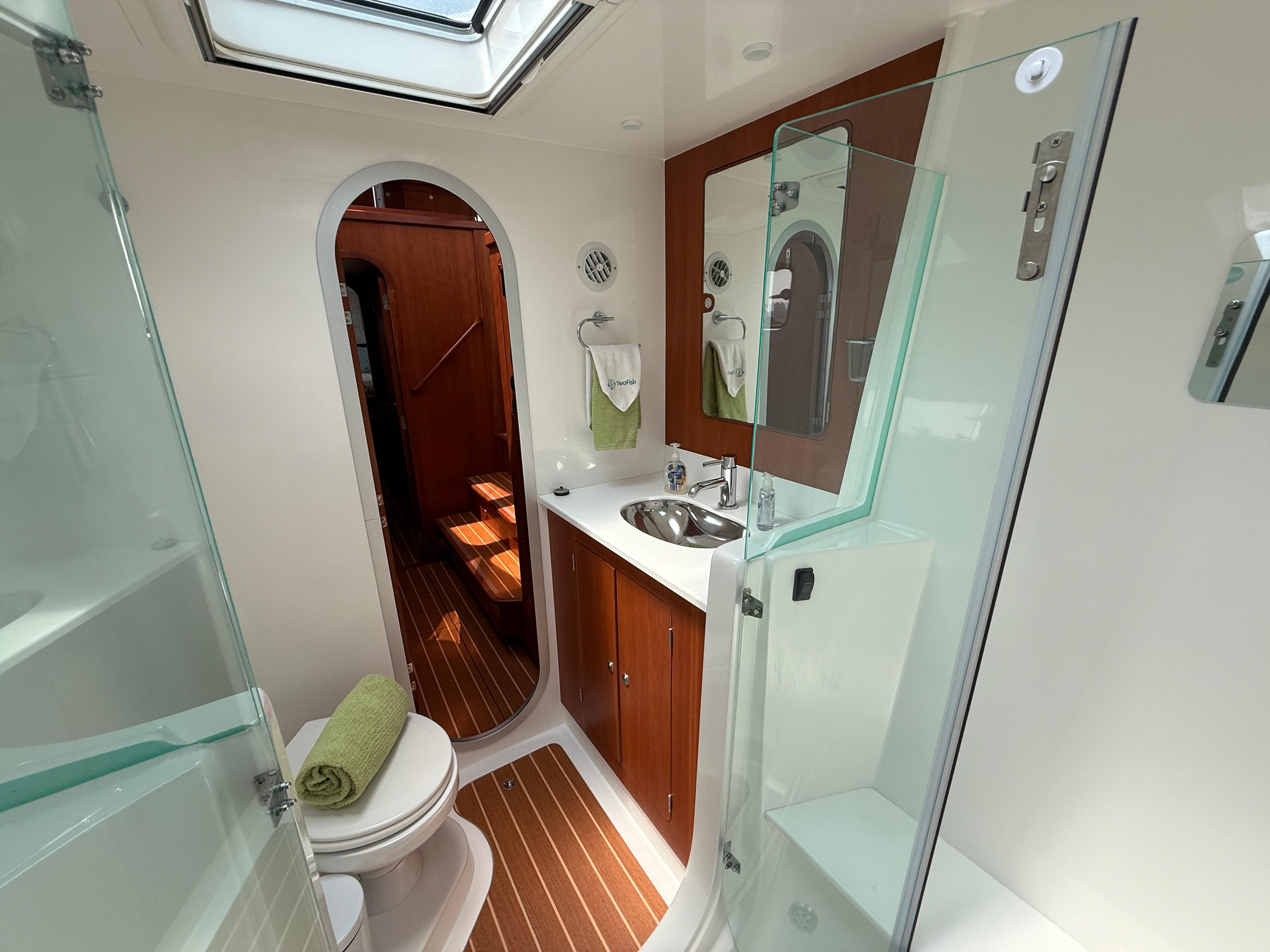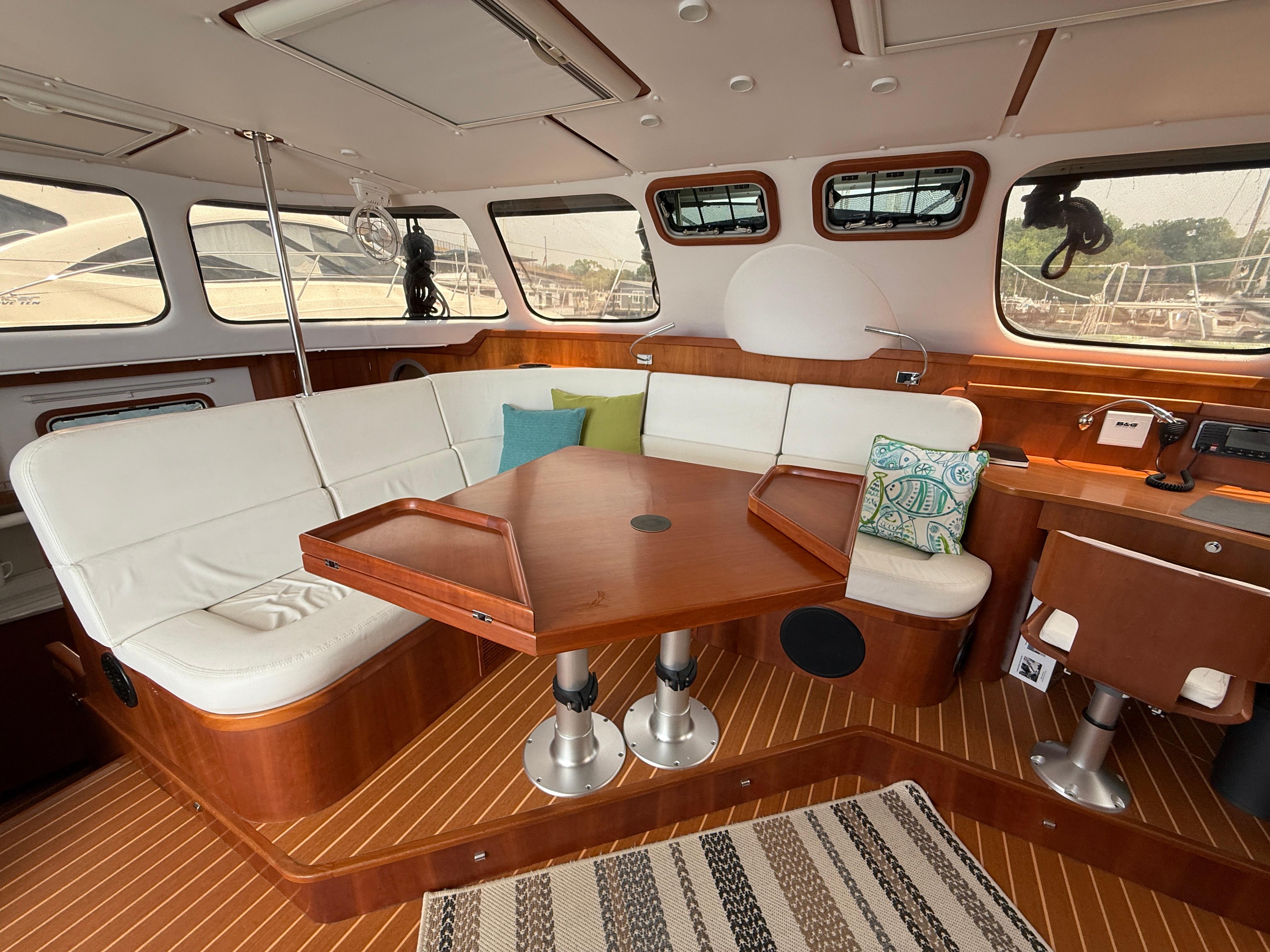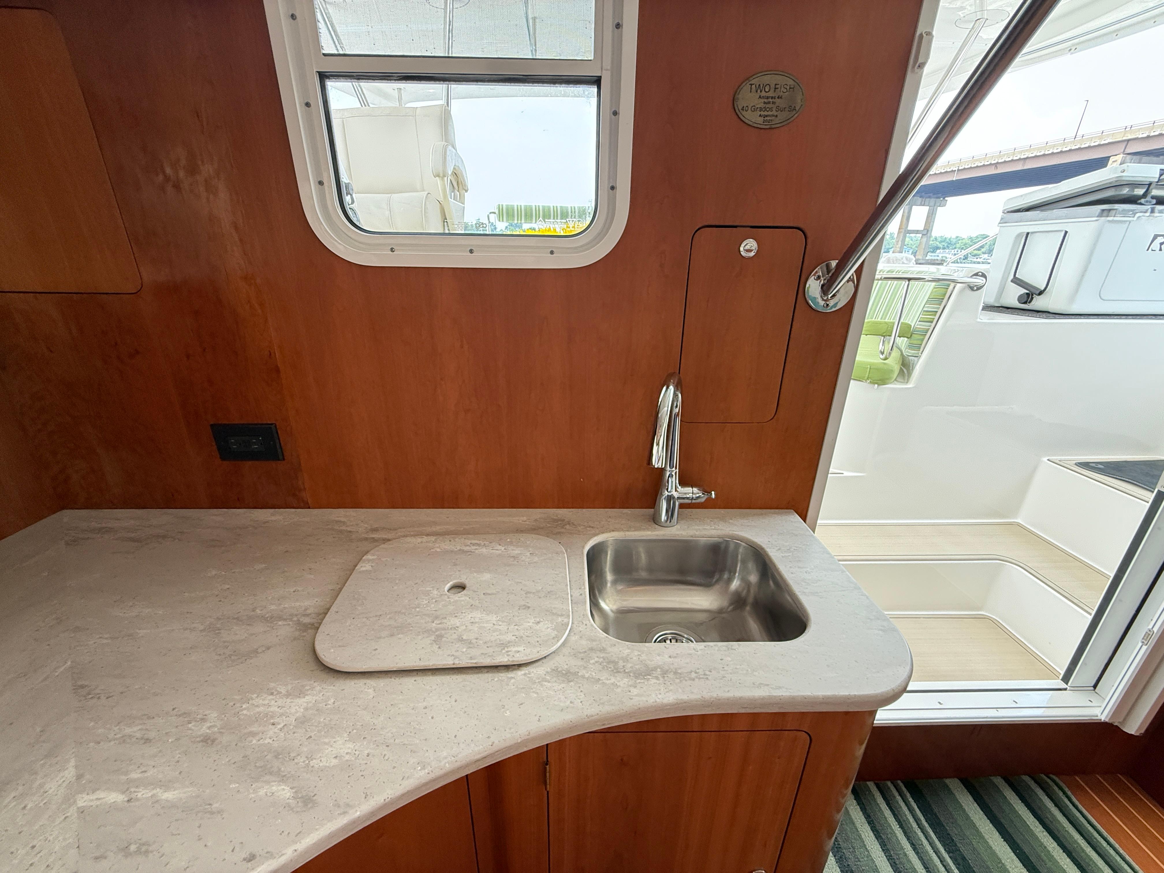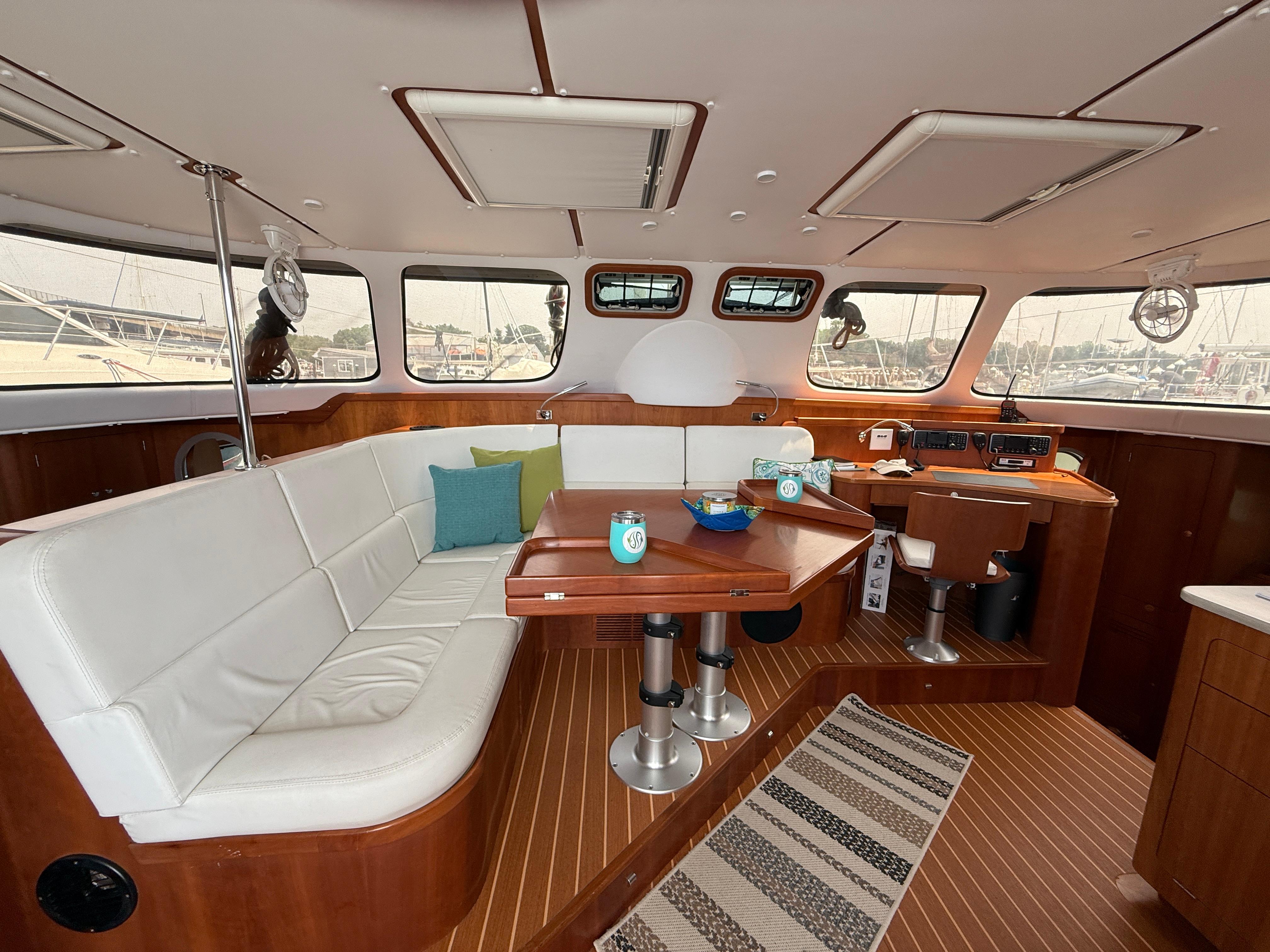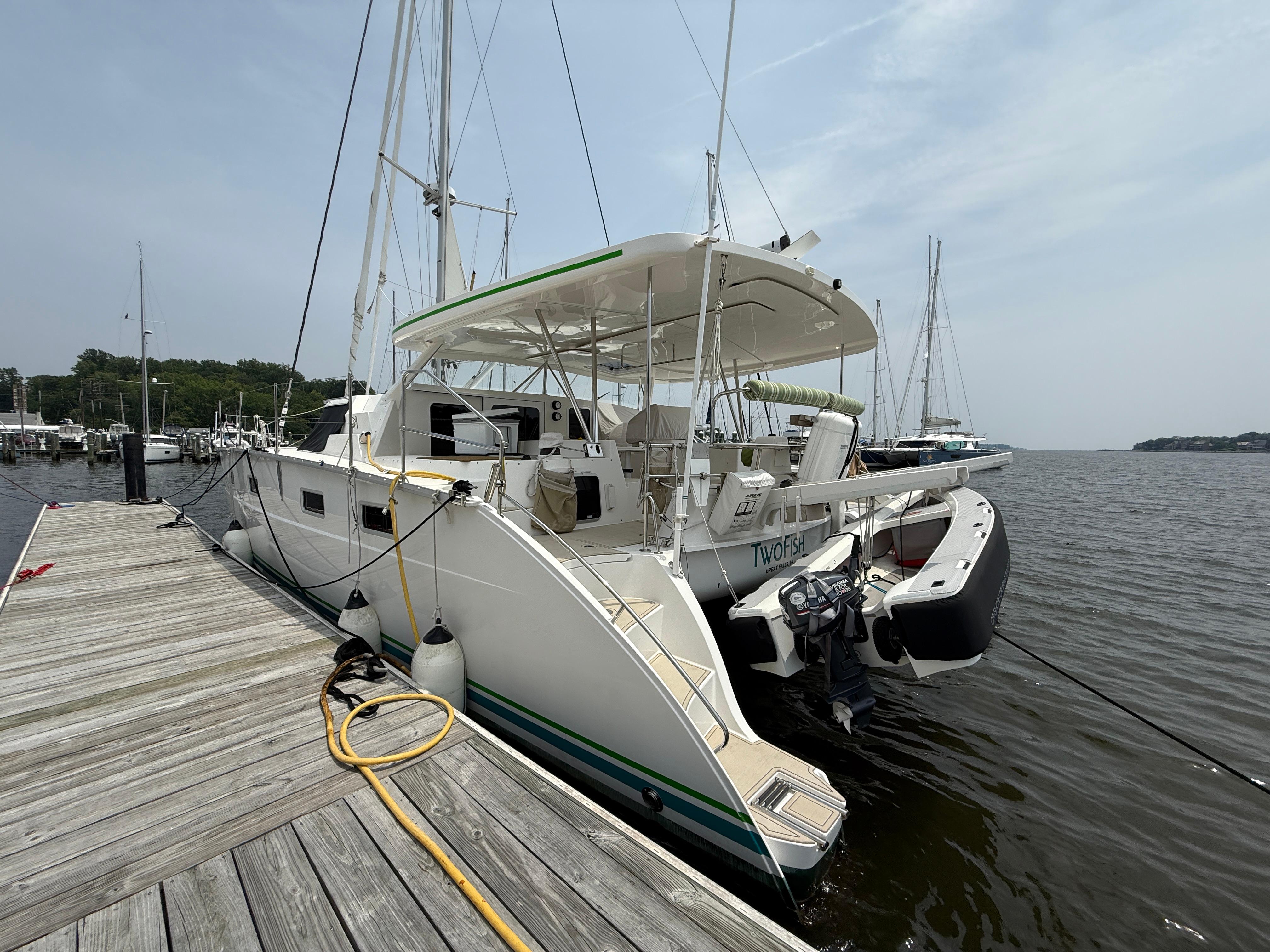Antares catamarans are built in Argentina and designed with a very different approach from most builders. They offer shaft drive with an easy access to each engine amidship. Antares are built for comfort, safety and performance with a fully enclosed cockpit and a protected helm. Two-Fish offers an in-mast furling mainsail, a 130% genoa and furling screecher and an asymmetrical spinnaker. She is perfect for family cruising or for a short handed crew. The interior woodwork is high quality cherry wood.
