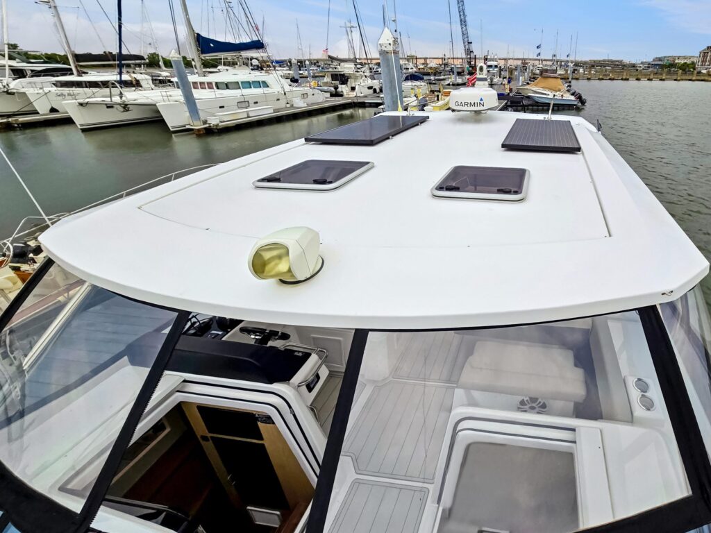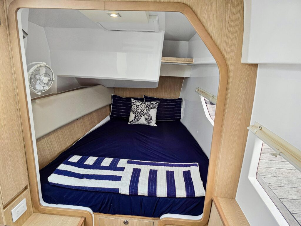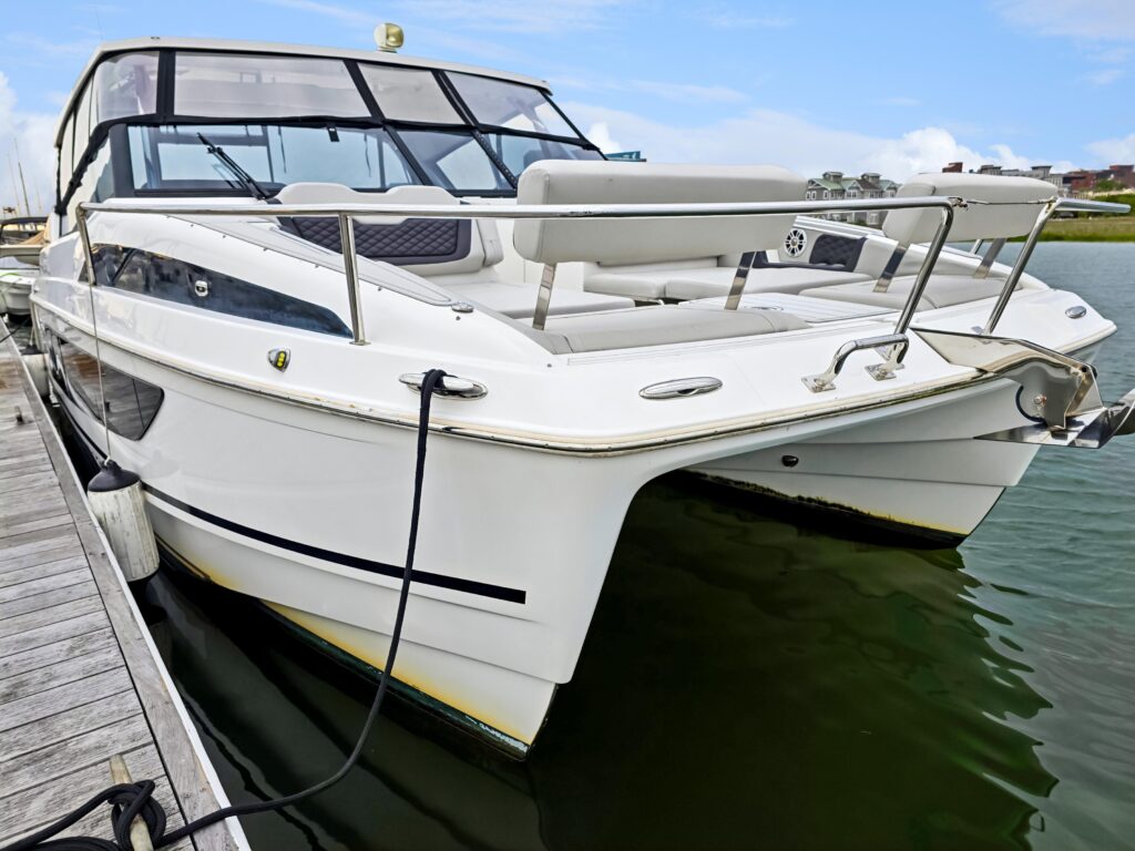 Meet "Calypso," a 2020 Aquila 36 Sport that delivers innovation, comfort, and versatility in a sleek power catamaran design. With a beam of just over 14 feet, she offers an impressive amount of living and entertaining space for a vessel her size. The 2-cabin, 2-head layout provides excellent overnight accommodations, while a fully equipped galley, featuring a stove and oven, refrigerator, icemaker, and built-in deck BBQ, ensures you're ready to entertain guests with ease, whether docked or underway.