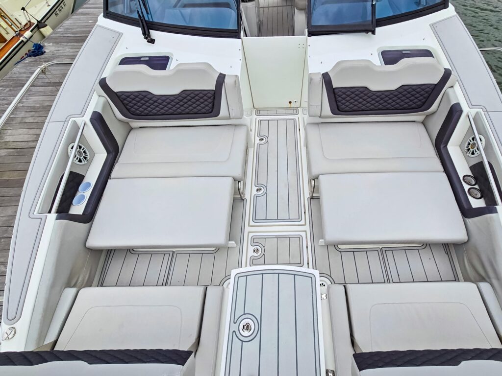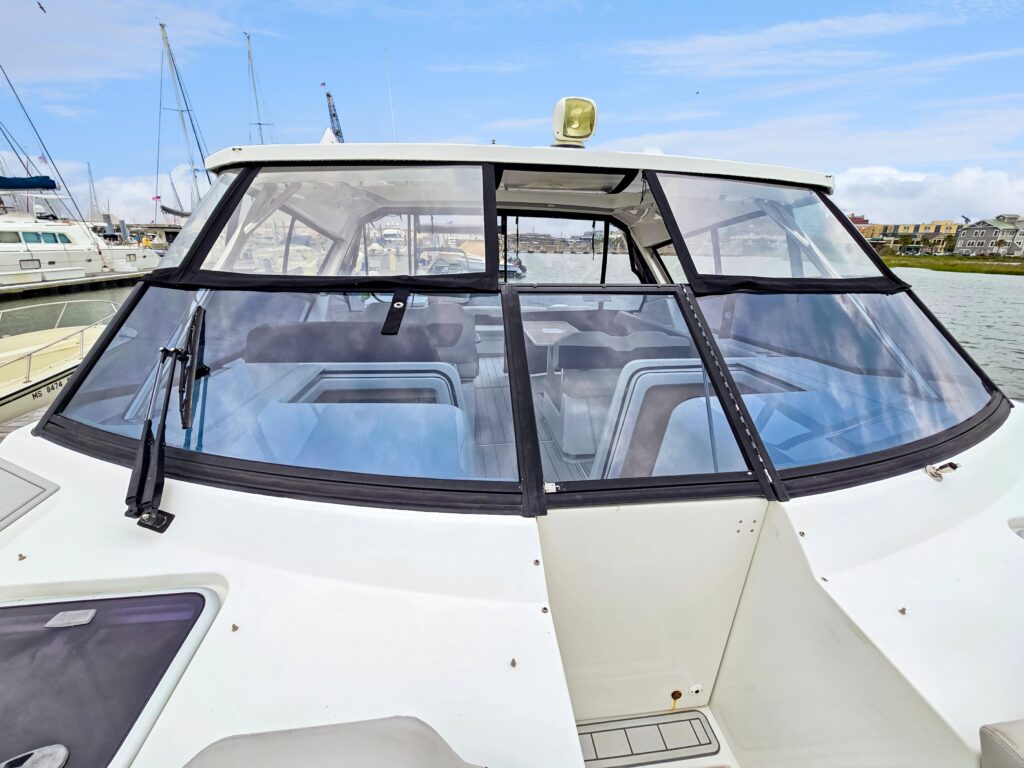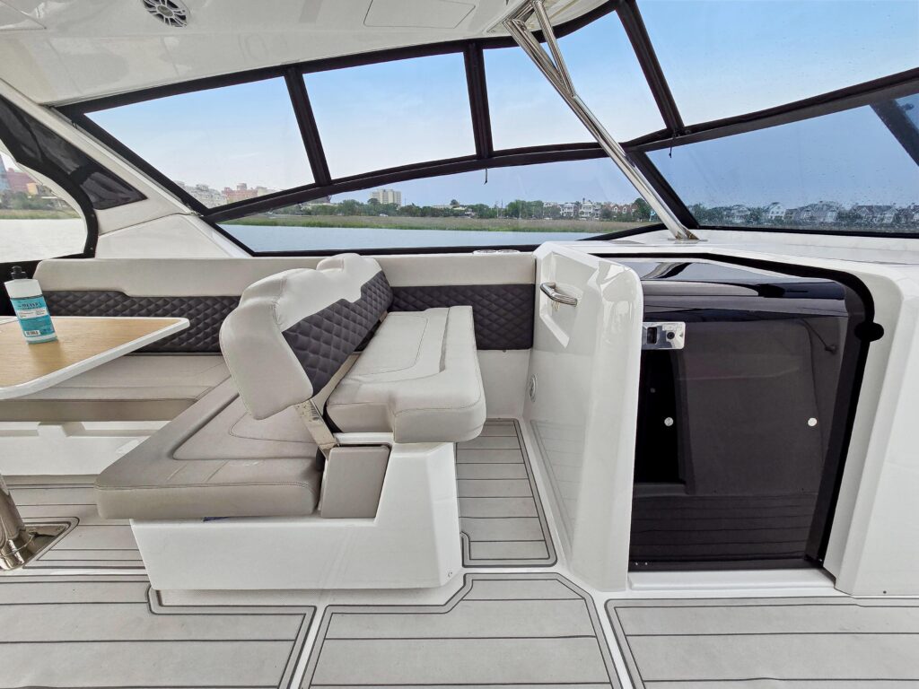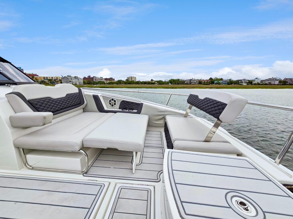 Whether you're out for a day cruise or a weekend getaway, "Calypsos" exterior layout is designed for versatility and enjoyment. The cockpit is shaded by a hardtop and fully enclosed with a windscreen, offering protection from the elements while maintaining panoramic views. This space includes the helm station and a comfortable dining area with L-shaped and aft cushioned seating surrounding a folding table, perfect for al fresco meals or sunset cocktails. A wide swim platform with integrated ladder makes water access seamless. Forward, guests can relax in a more private setting with cushioned lounge seating, ideal for sunbathing or enjoying the breeze.
