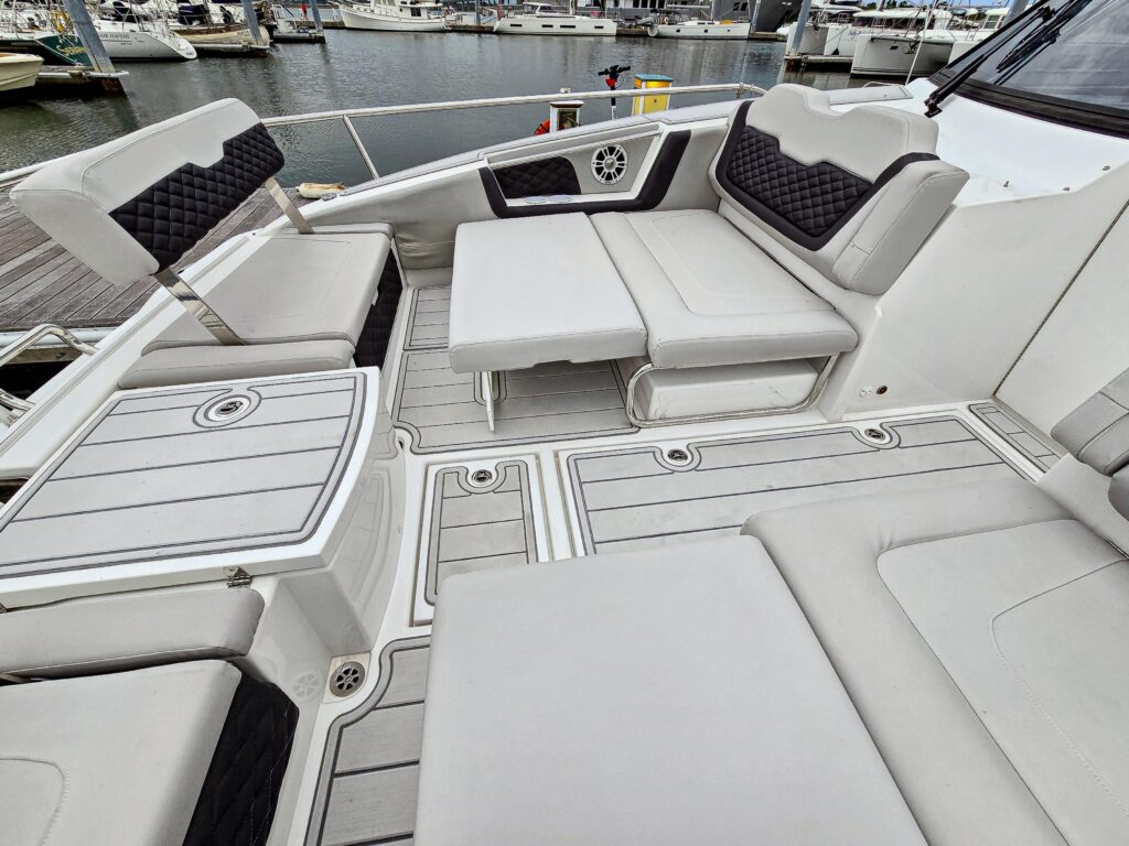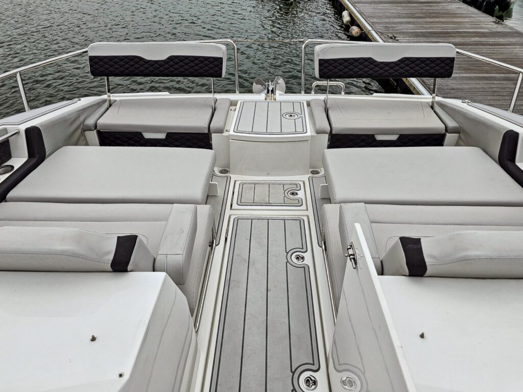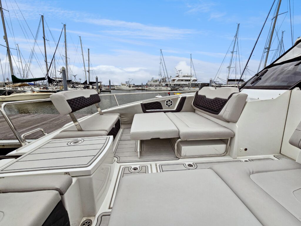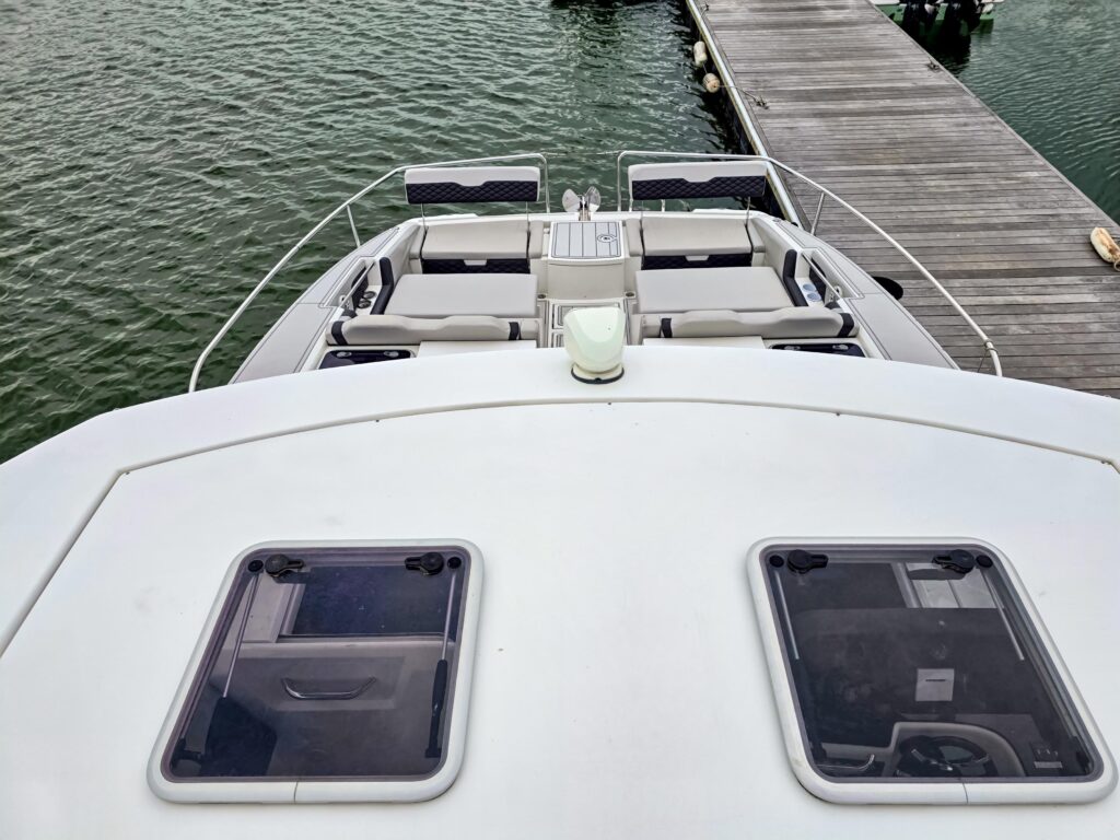 Whether you're out for a day cruise or a weekend getaway, "Calypsos" exterior layout is designed for versatility and enjoyment. The cockpit is shaded by a hardtop and fully enclosed with a windscreen, offering protection from the elements while maintaining panoramic views. This space includes the helm station and a comfortable dining area with L-shaped and aft cushioned seating surrounding a folding table, perfect for al fresco meals or sunset cocktails. A wide swim platform with integrated ladder makes water access seamless. Forward, guests can relax in a more private setting with cushioned lounge seating, ideal for sunbathing or enjoying the breeze.
