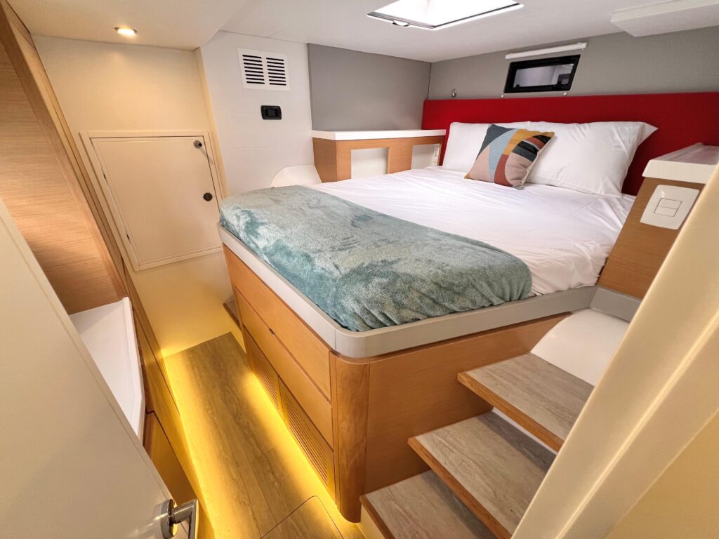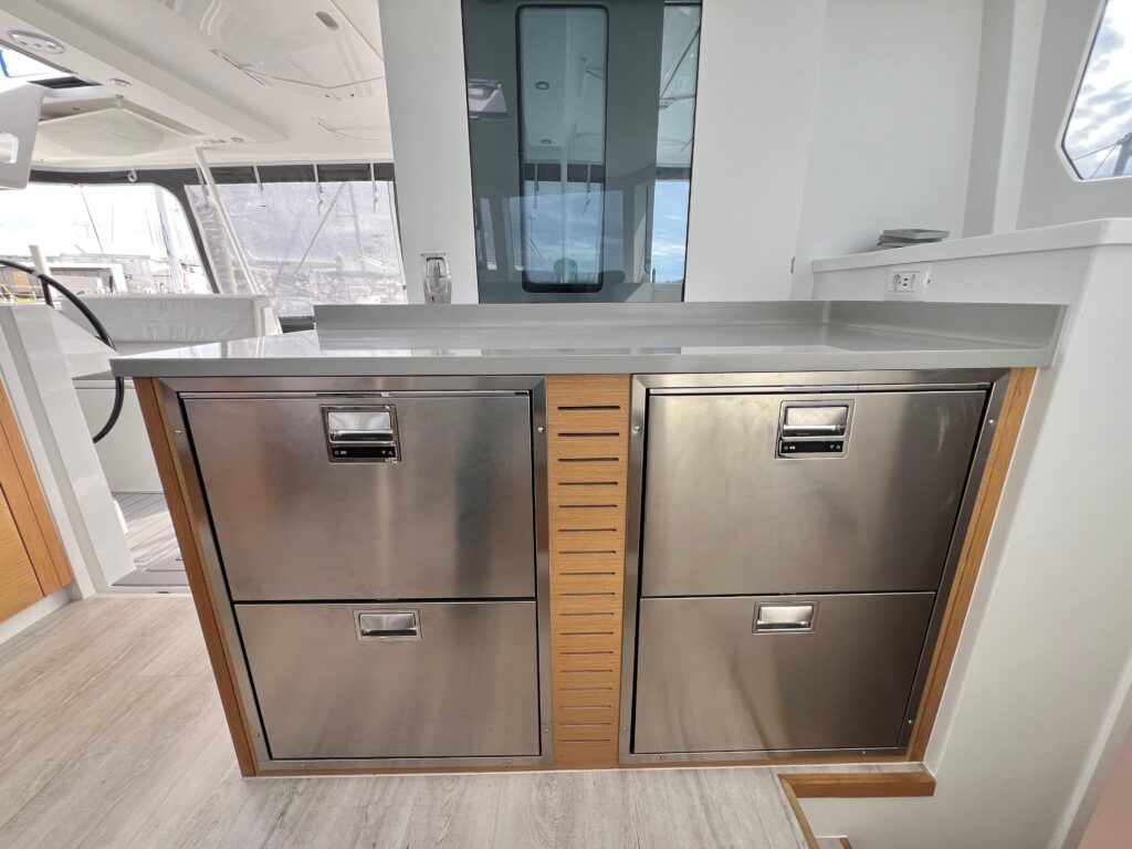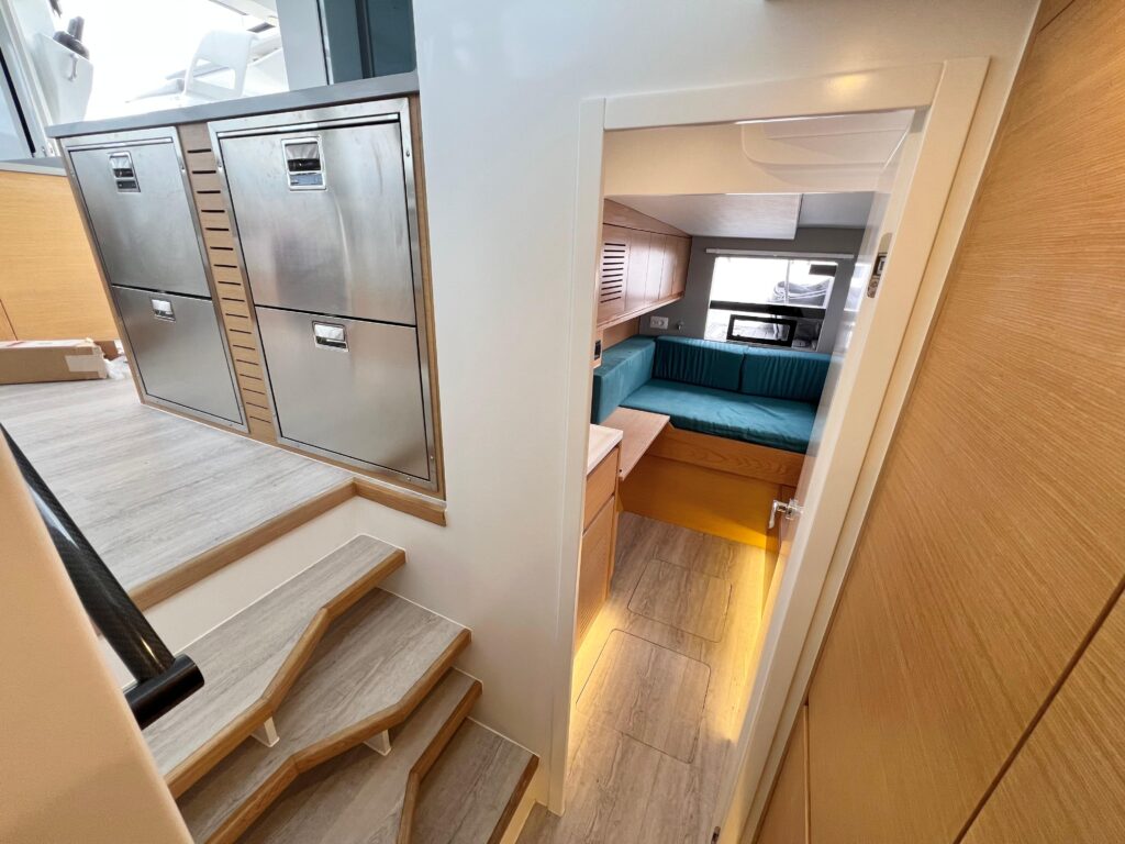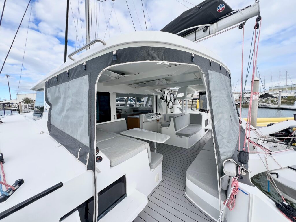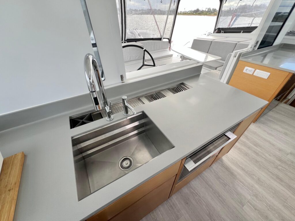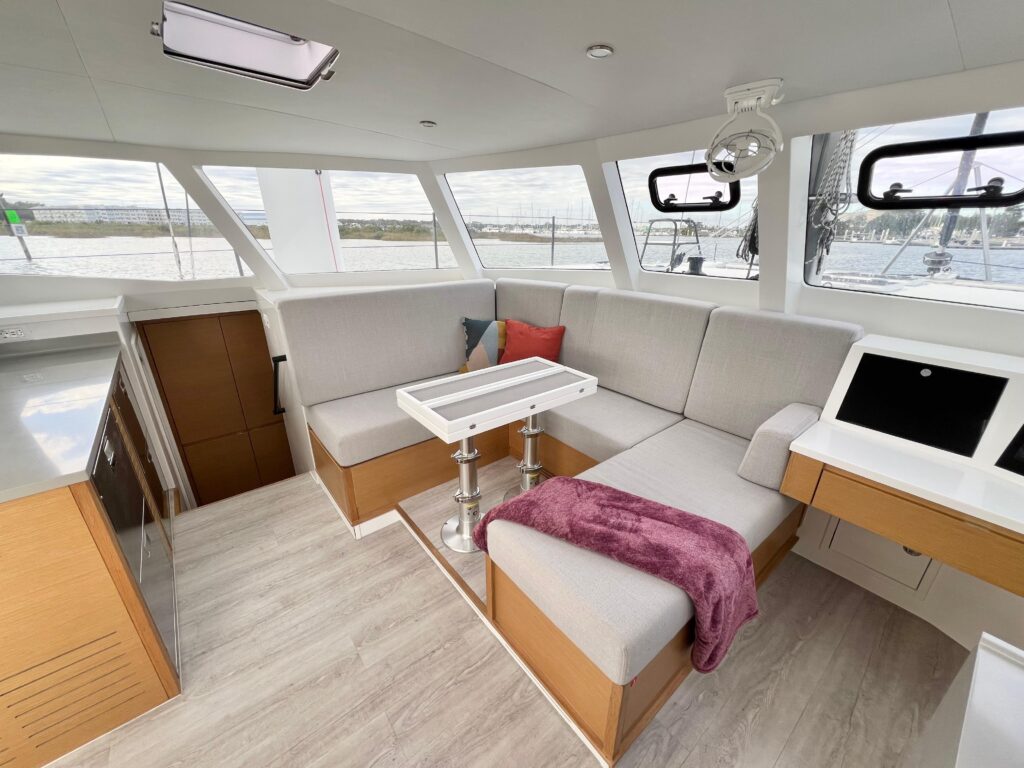 Kiwa is a pleasure to move about on whether sailing alone or entertaining friends and family. Her ample payload capacity means there is a place to store everything on the 442. Seating and lounge areas are strategically located throughout the cockpit and accommodation areas to ensure a fantastic hosting platform. With the innovative Balance VersaHelm – the helm station swings up and down with ease which revolutionized all weather sailing. You can pilot her up top in the sunshine and breeze or swing the helm down for full foul weather protection in the comfort of the cockpit – both positions offer 360 degree visibility and comfortable seating.