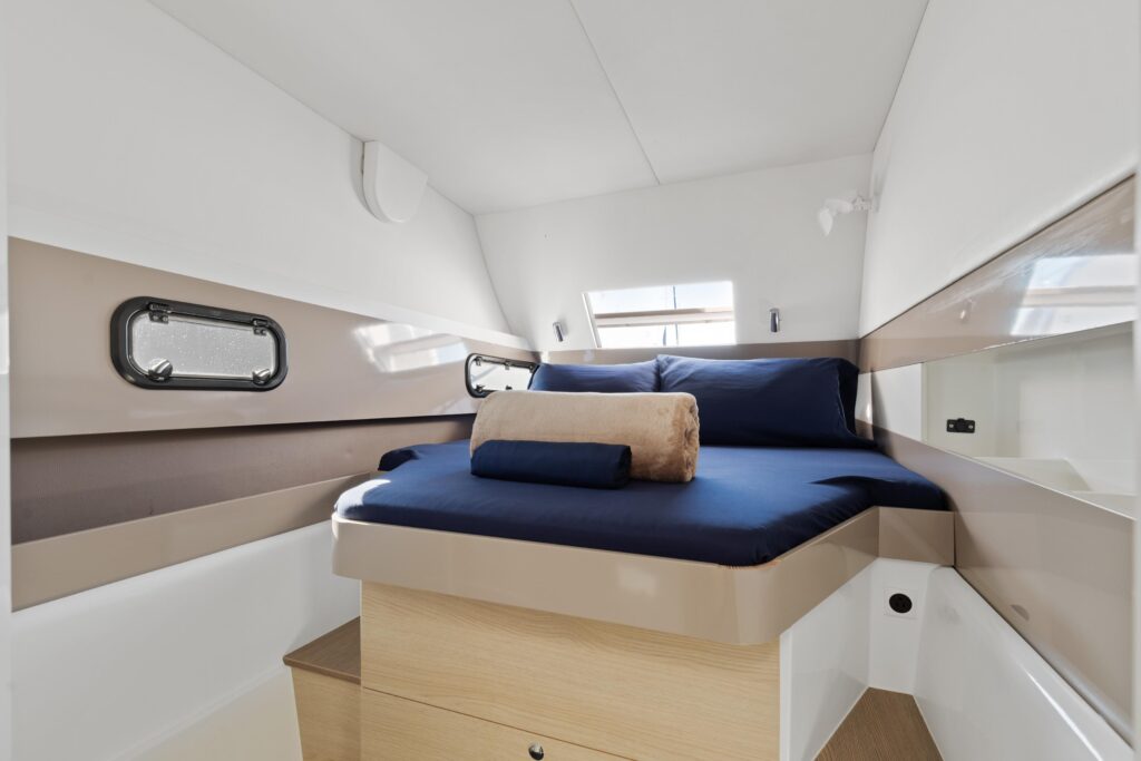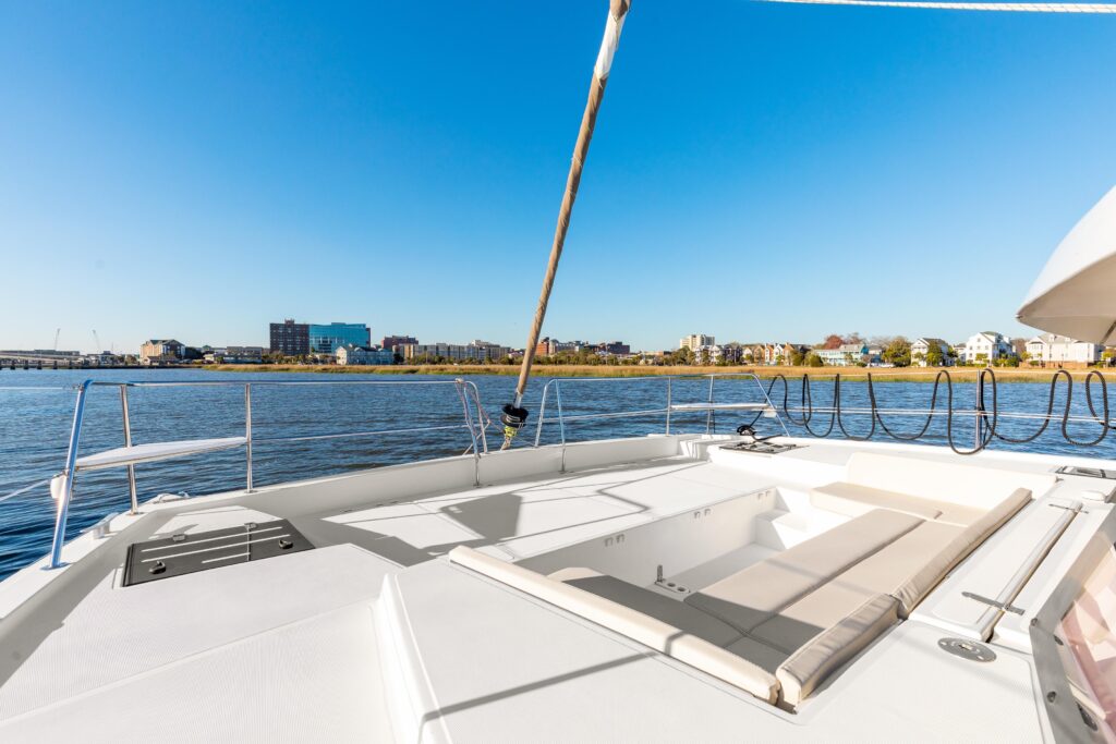 Forward cushioned sun lounge area in lieu of traditional catamaran trampoline