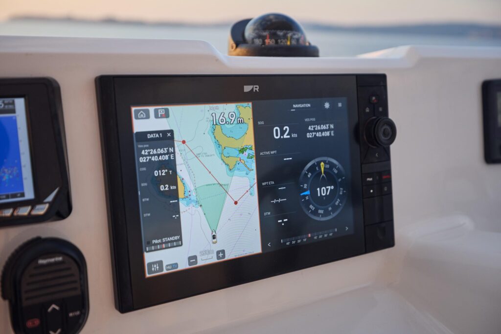 The salon of the OMAYA 50 has plenty of space for relaxing, dining, reading your favorite book, or catching up on the latest movie on the big screen TV. There is a commanding helm station with the latest technical equipment.