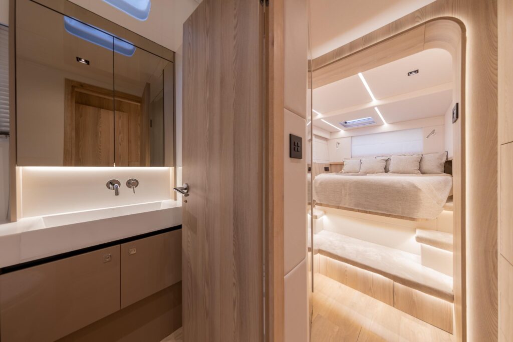 The OMAYA 50 has generous lower deck space and offers two configurations. The owner version provides a large master cabin that takes up the entire port side with double bed, sofa, desk and vanity area, integrated wardrobe space, and a large ensuite with double basins and a full standing shower.