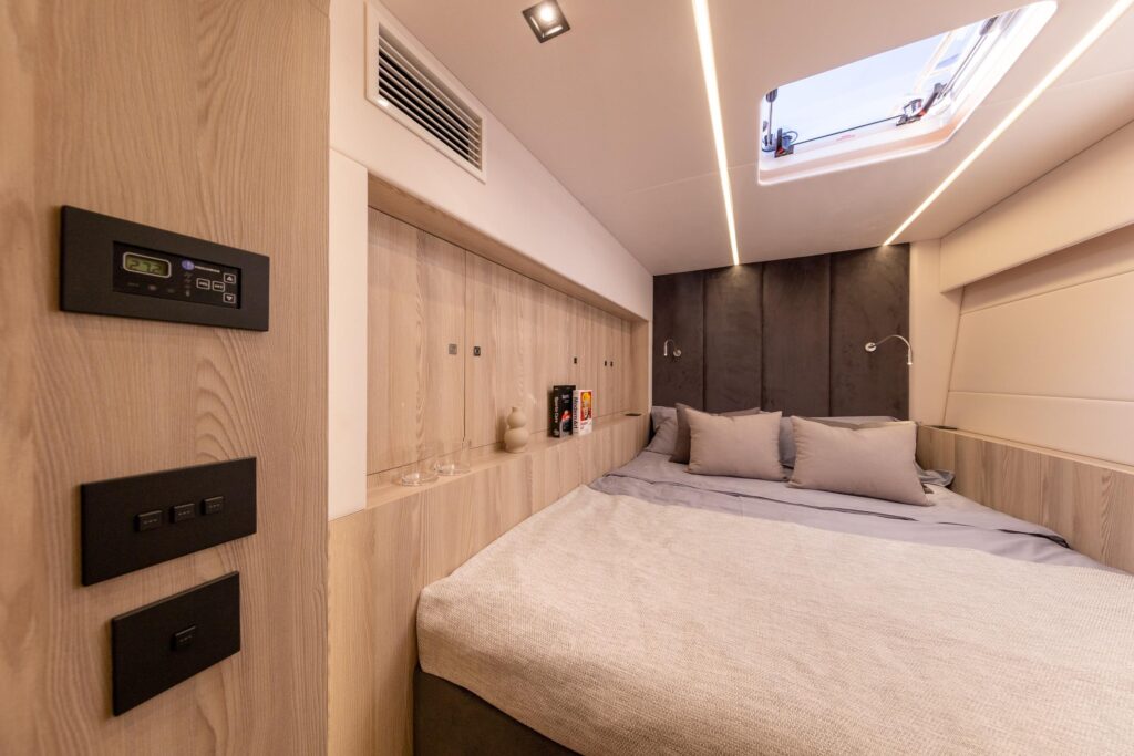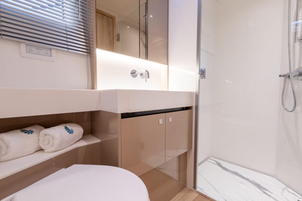 There are two double guest cabins on the starboard side with ensuite bathrooms and integrated wardrobe space. There is an additional crew cabin in the starboard forward peak.