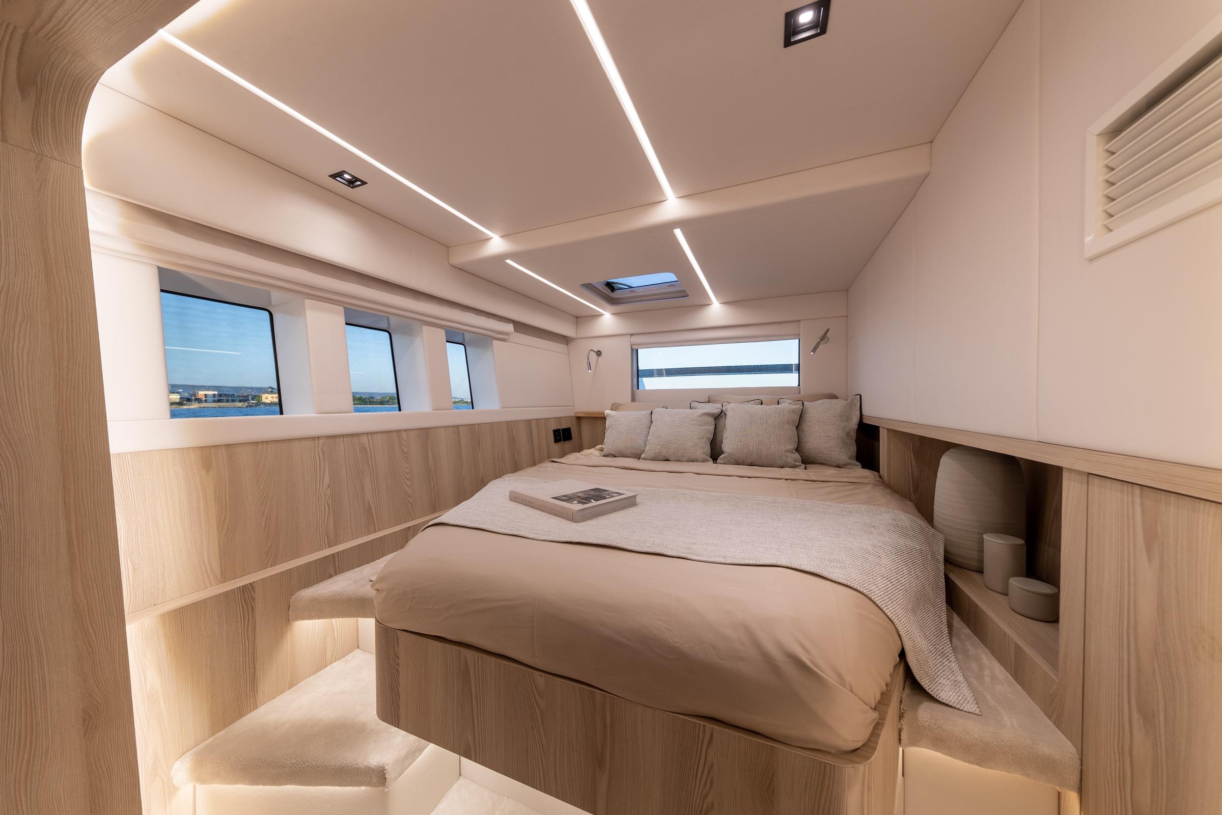 The OMAYA 50 has generous lower deck space and offers two configurations. The owner version provides a large master cabin that takes up the entire port side with double bed, sofa, desk and vanity area, integrated wardrobe space, and a large ensuite with double basins and a full standing shower.