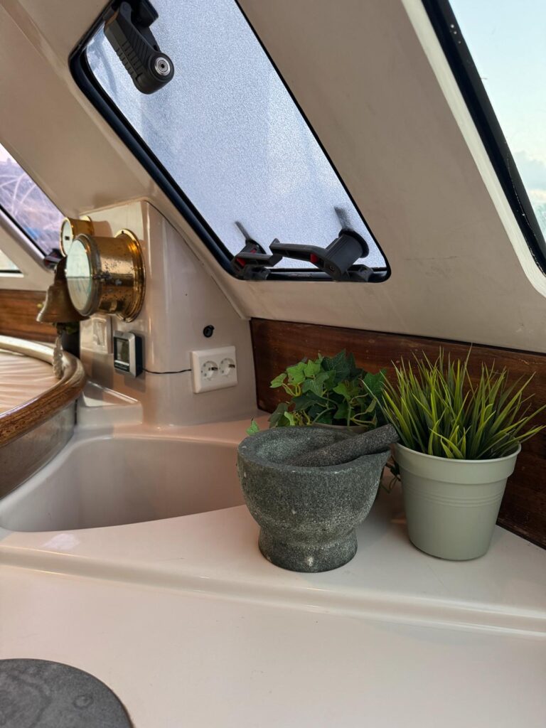 The boat is equipped with a 600 Ah lithium battery pack and a total of about 1000 Ah AGM batteries. This provides plenty of electricity for longer trips. The lithium batteries are practically “stand alone” and provide power to a 3000W Victron Multiplus inverter/charger. This is connected to a fuse box and supplies 230V power to at least 12 different sockets distributed throughout the boat. Shore power connection goes to the same fuse box.