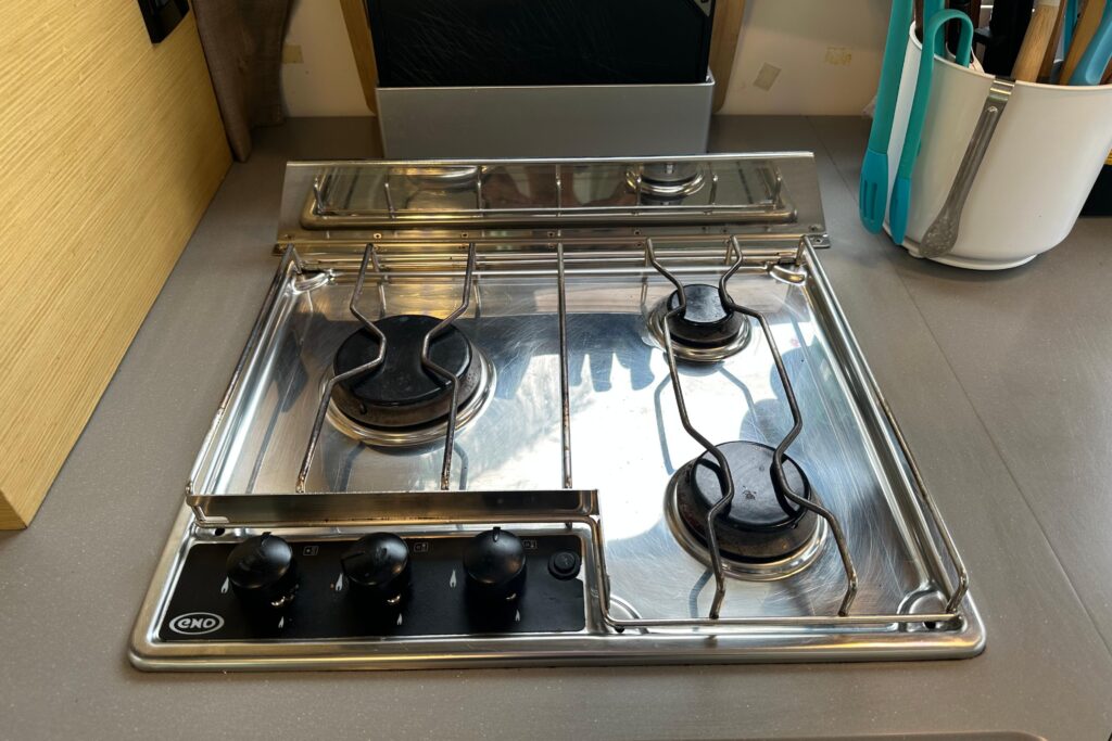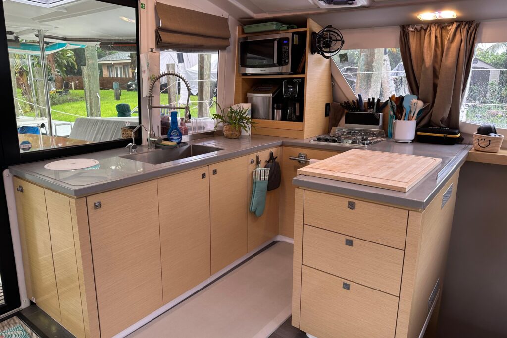- A fully equipped galley with both electric and gas appliances, dual-drawer refrigerator, standalone freezer, cockpit fridge, ample counter space, and generous storage