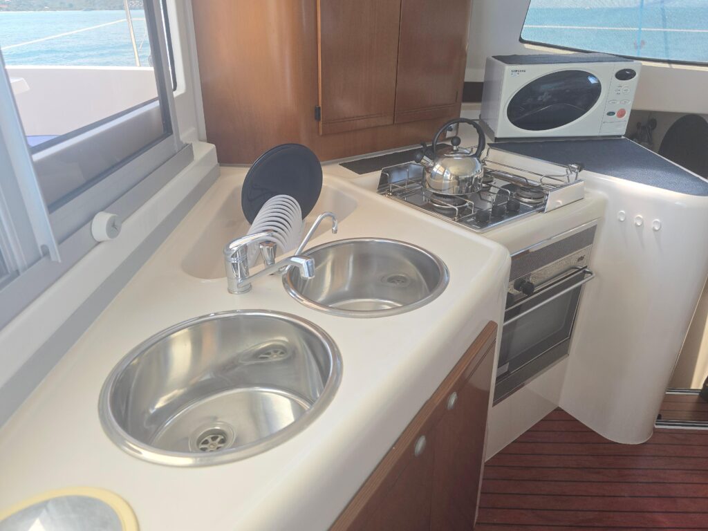 The Galley is located on the upper port side of the Saloon, with a spacious booth like dining table on the starboard side and adjoining nav station.