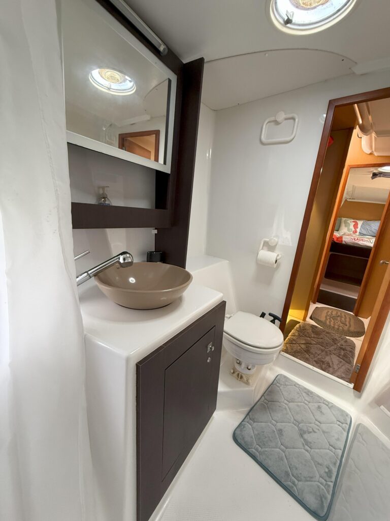 The cabins have been positioned to optimize privacy and peace, with queen size aft beds and large port holes that provide beautiful natural light though out. The bathroom is extraordinarily large and appointed with sleek designer fixtures, separate shower with excellent splash protection and an easily accessible toilet.