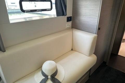 The galley, running the full length of the saloon, has all the equipment you need to enjoy preparing meals onboard with direct communication to the cockpit. The bright and cosy saloon incorporates the sea into your life at any time of day. Her hard-top with its sunroof ushers in the sun and natural air whenever you want it