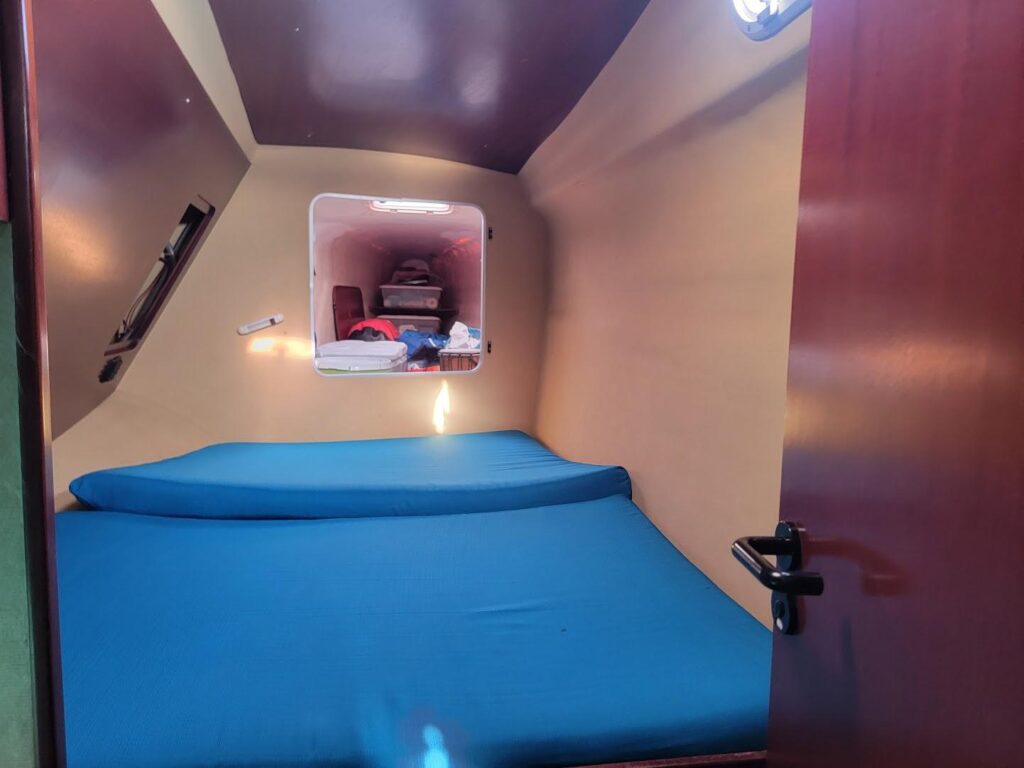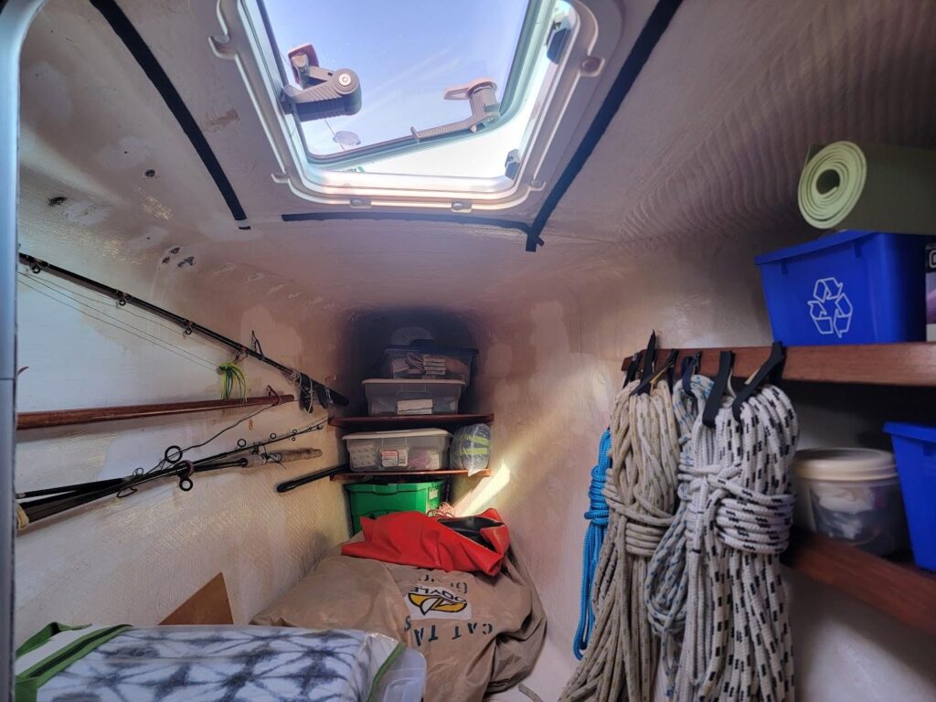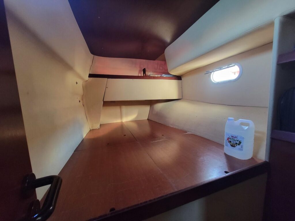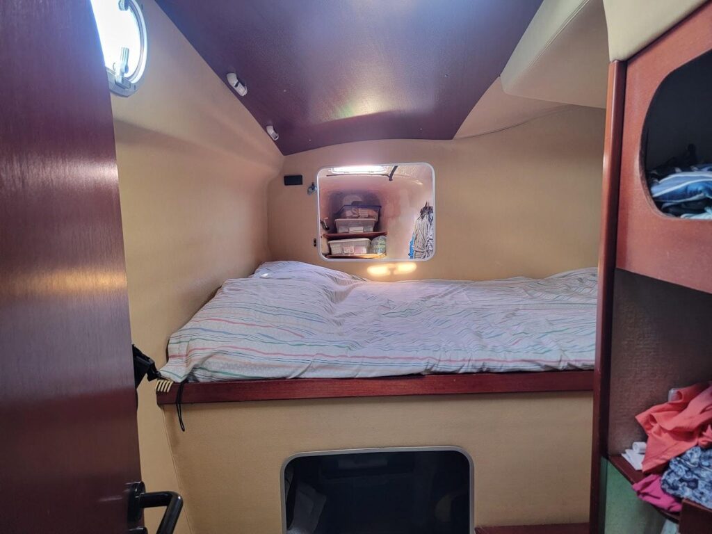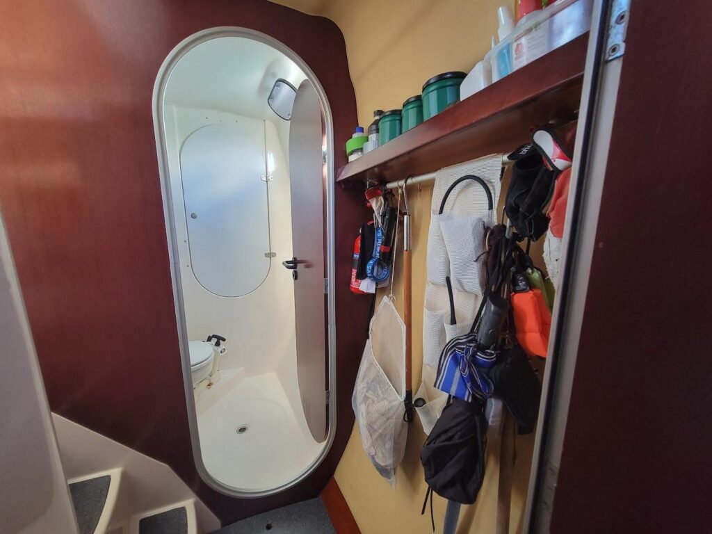 The helm has a custom table / chair arrangement that is business up front and party at anchor. The raised saloon area allows for panoramic views while under way or enjoying a meal. One hull is the owners side with double berth thwartship and head. Access to the ample and well-organized mechanical area is just through the head. The other hull contains two cabins.