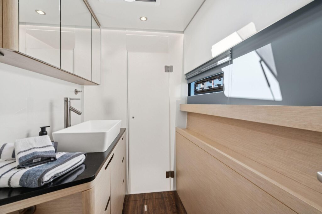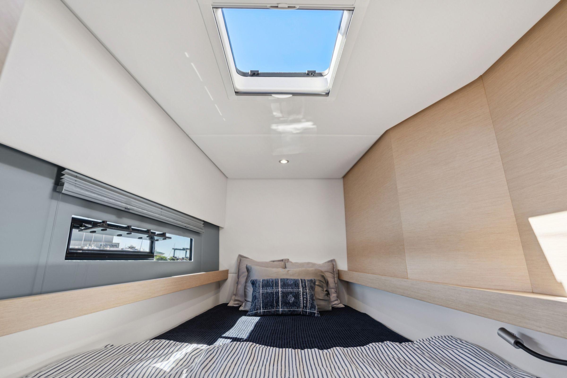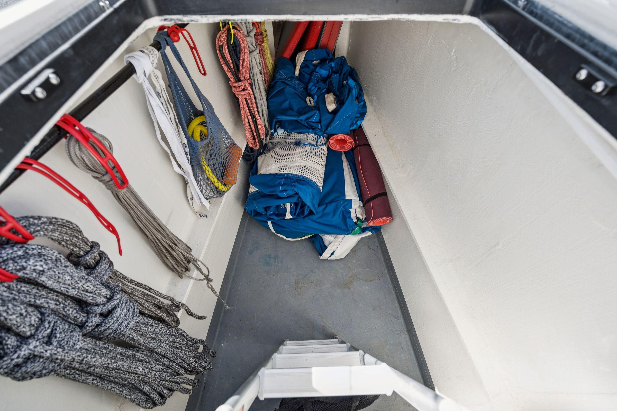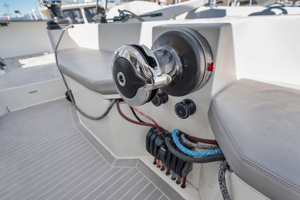 The longeron is crafted from carbon composite, and the forward crossbeam features a laminated carbon I-beam encased in a composite shell, ensuring exceptional rigidity and performance. For long-term reliability and to prevent moisture penetration, all thru-hulls and deck fittings are installed in solid laminate. For safety at sea, both the forepeak and lazarette lockers are equipped with watertight bulkheads and crash boxes.