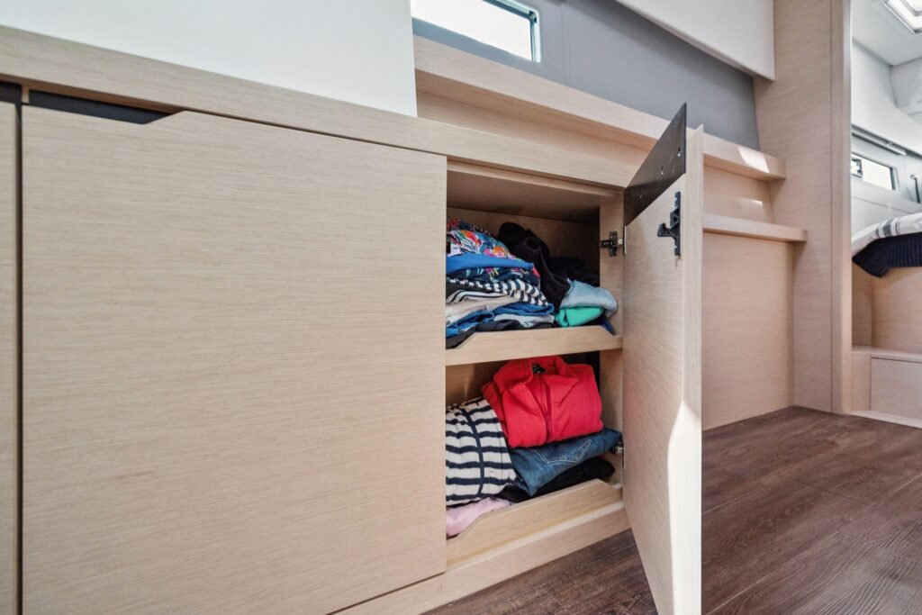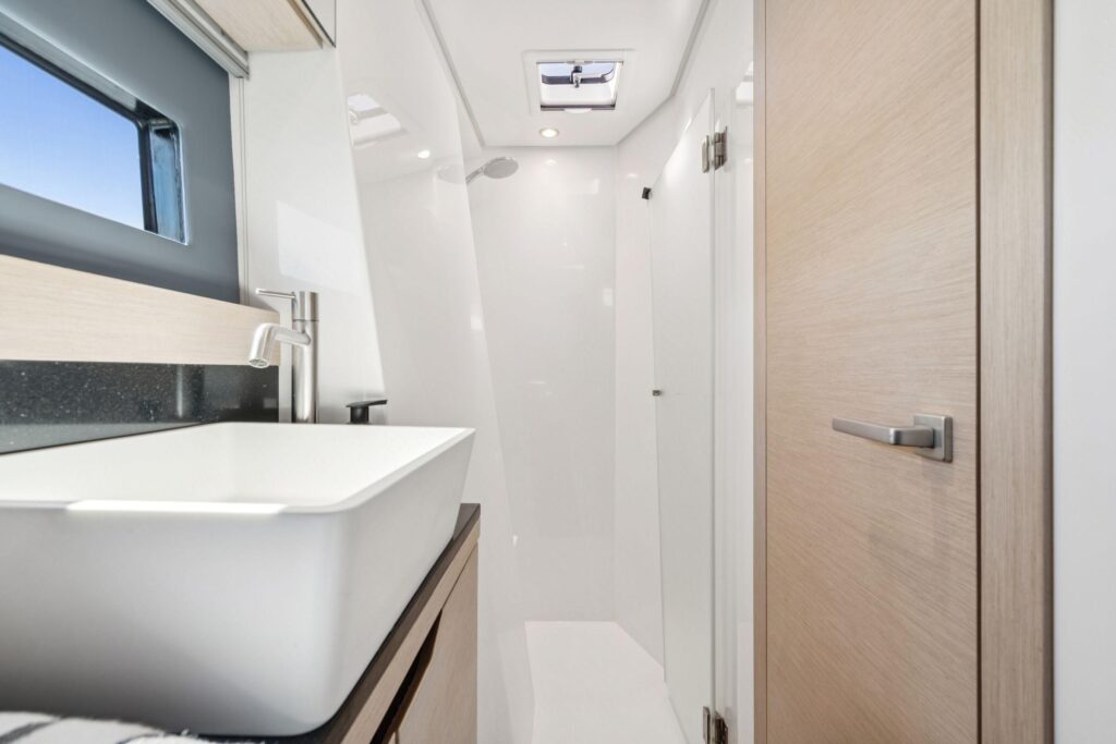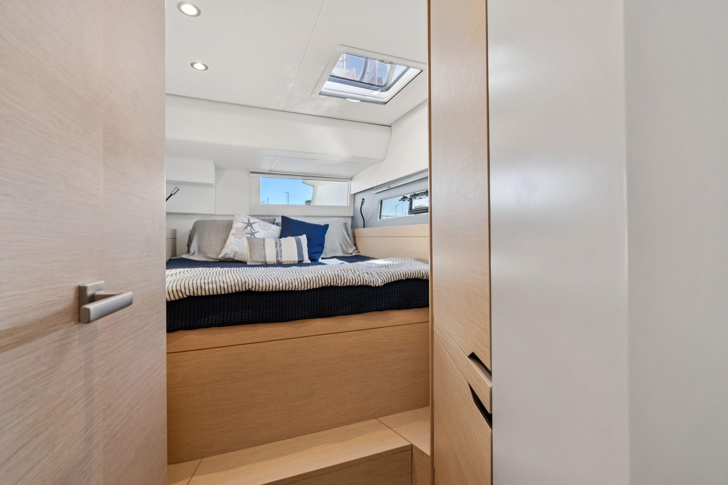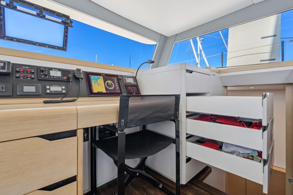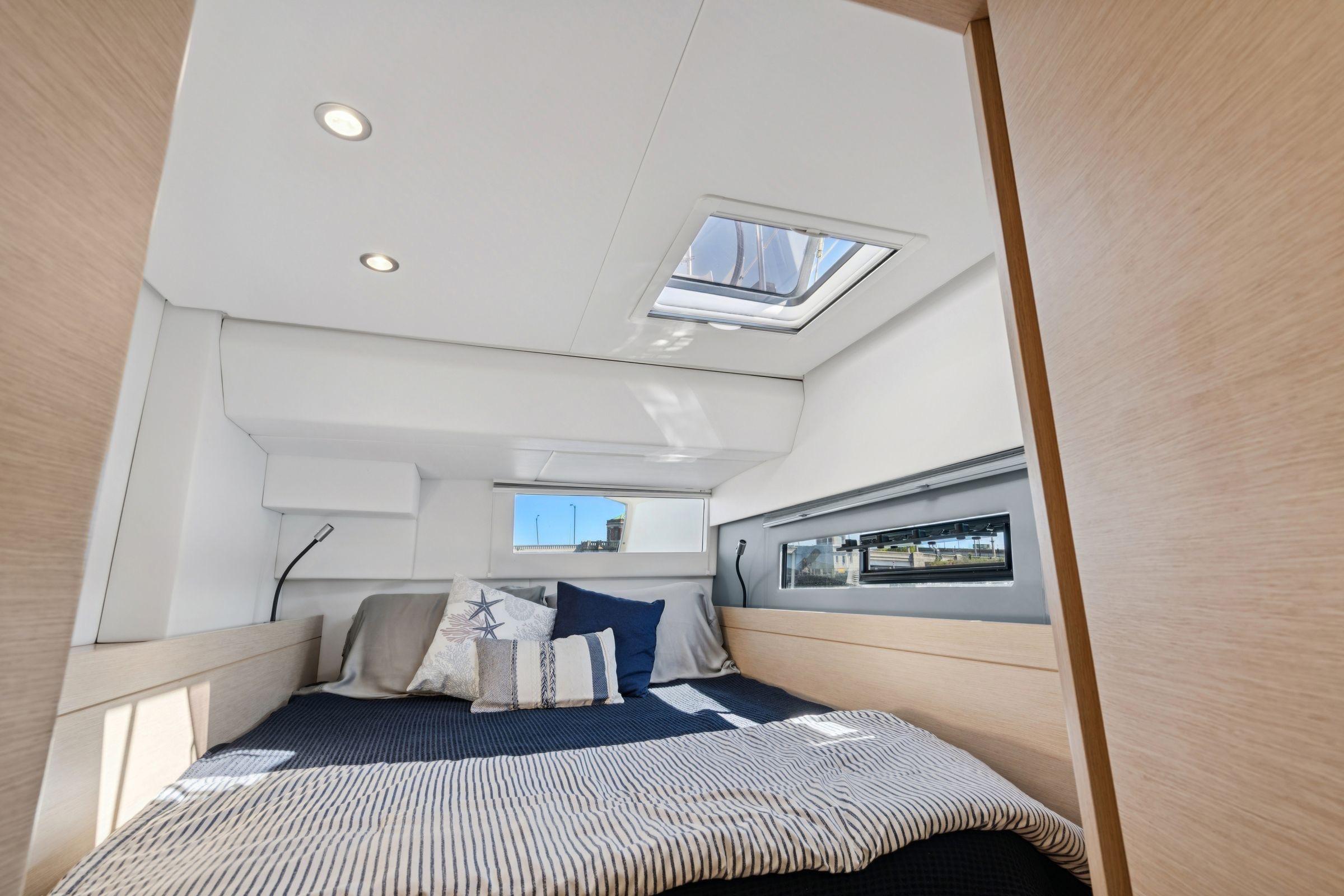 The longeron is crafted from carbon composite, and the forward crossbeam features a laminated carbon I-beam encased in a composite shell, ensuring exceptional rigidity and performance. For long-term reliability and to prevent moisture penetration, all thru-hulls and deck fittings are installed in solid laminate. For safety at sea, both the forepeak and lazarette lockers are equipped with watertight bulkheads and crash boxes.