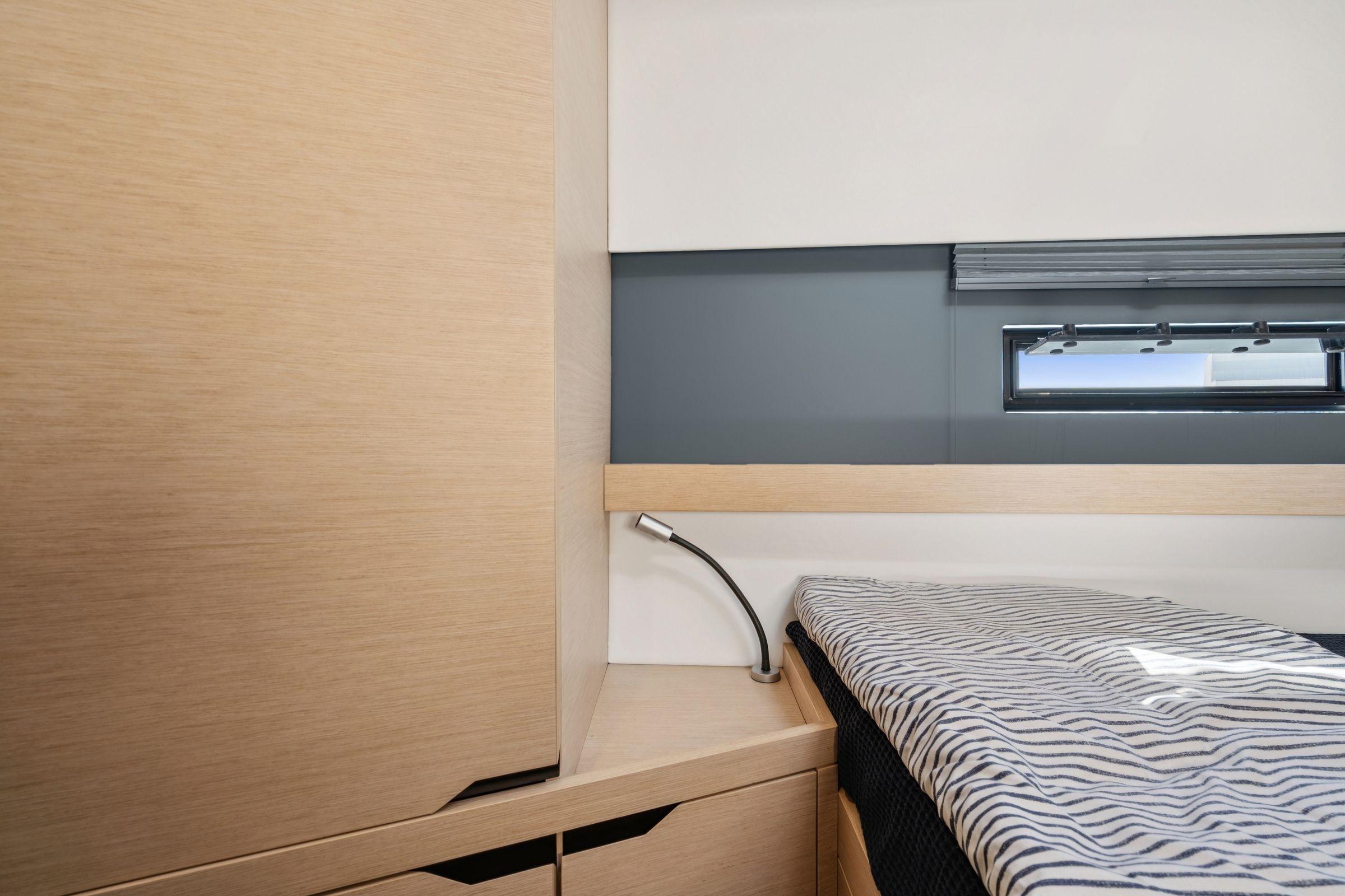 Queen size bed with Cocomat latex mattress & washable mattress cover; 2x lateral steps for easy access & shoe storage; bookshelf inboard; wardrobe locker outboard; 2x LED reading lamps at head of bed
