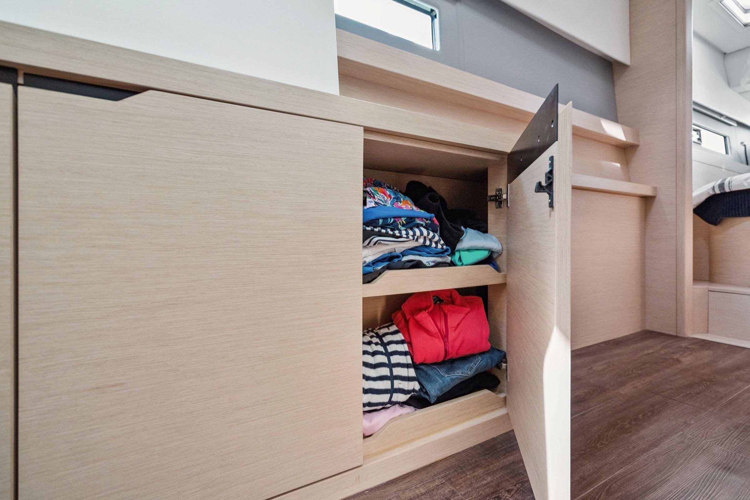 Multiple wardrobe lockers and shelves inboard; wardrobe lockers & shelf outboard in lieu of desk & seat; fixed window outboard