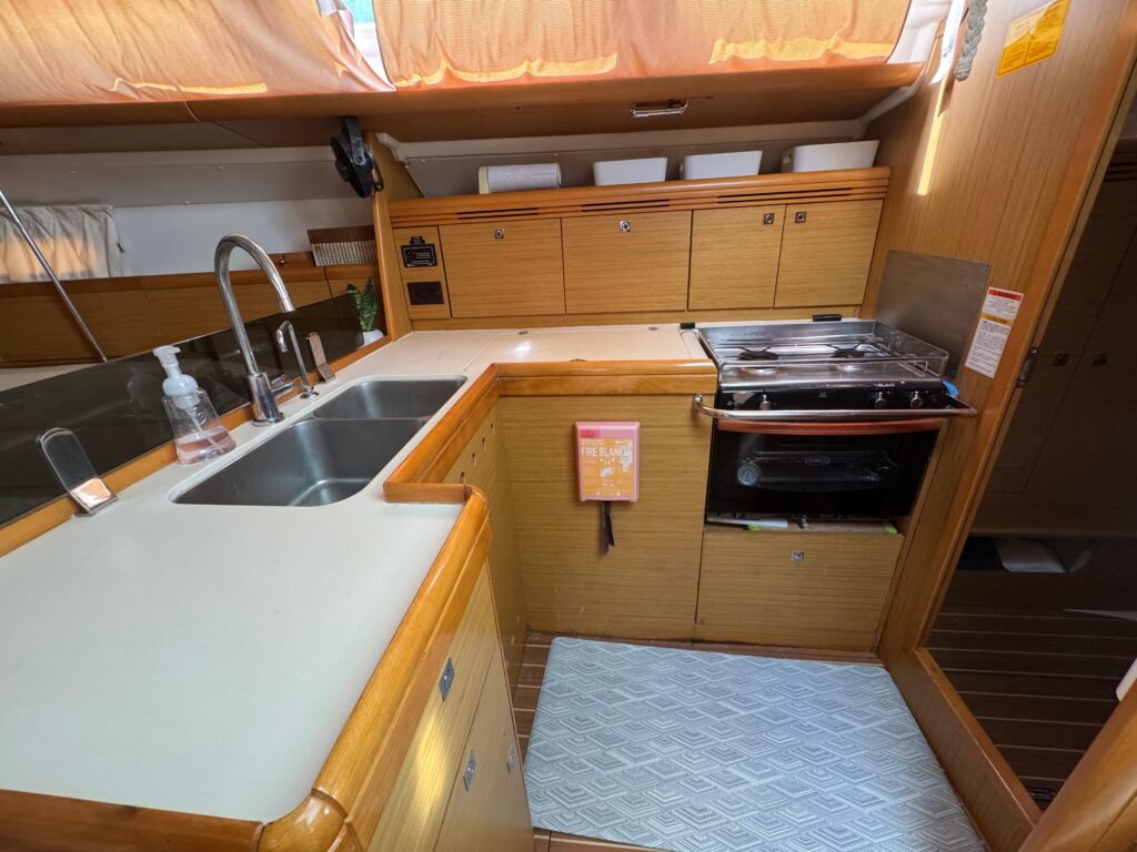 The ultra-comfortable Sun Odyssey 42i is designed in the true maritime tradition and is perfect for Solent yacht charter or private owner use. This yacht offers spacious, functional below-deck accommodation with 3 cabins and 2 head compartments. Technical equipment is fully integrated to release the maximum possible space for on-board comfort. The Jeanneau Sun Odyssey 42i Performance lines are modern and flowing with a generous sail plan. Pelican Pat is a two-aft cabin version. The galley is an efficient and attractive feature of the boat, and the cabin has sizable overhead grab rails that are easy to reach.