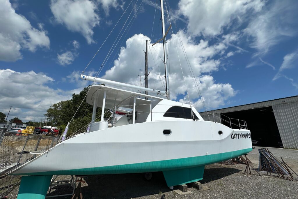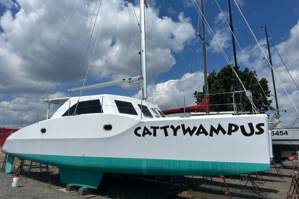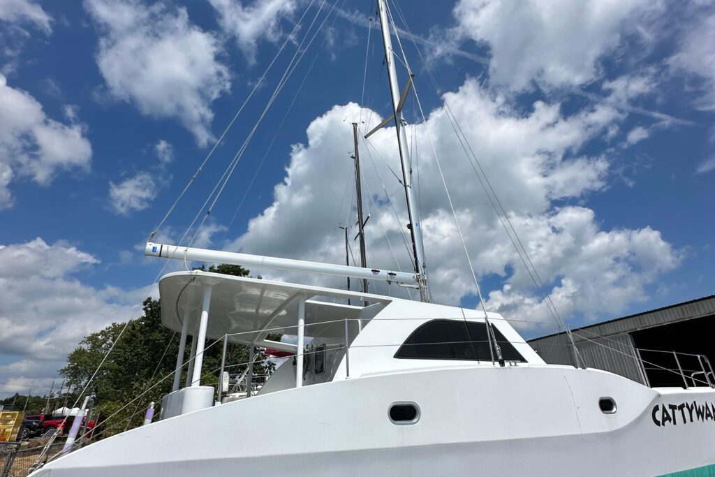 Cattywampus was built at Maine Yacht Center. The build is complete and the boat is fully operational under power. The fit out of systems, electrical and rigging is yet to be done. No sails.