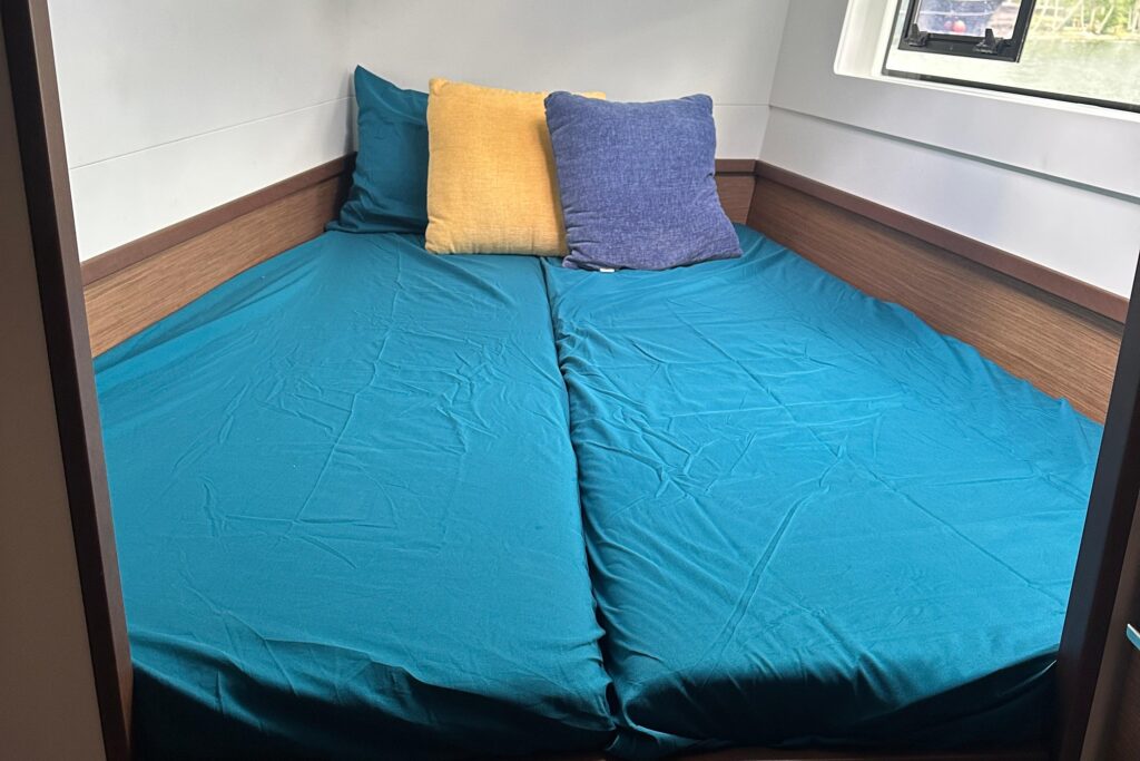 Dimensions of two Aft cabin beds are 2 m long X 1.6 m wide. Forward cabin bed is 2 m long X 1.6 m wide, at the widest end.