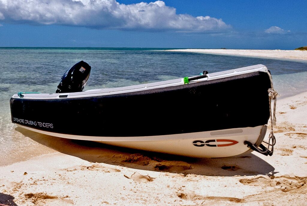 The sale includes a lightweight Offshore Cruising Tender (OC 300) with a 2023 Suzuki 9.9HP 4-stroke outboard.