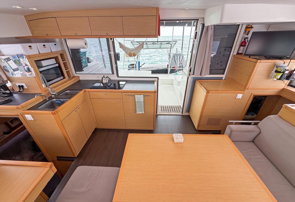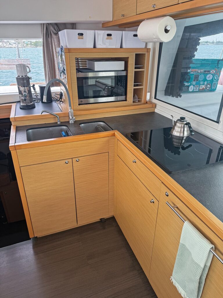 fully-electric galley:four-hob induction range and a 1,050-watt microwave oven with convection and air fry options