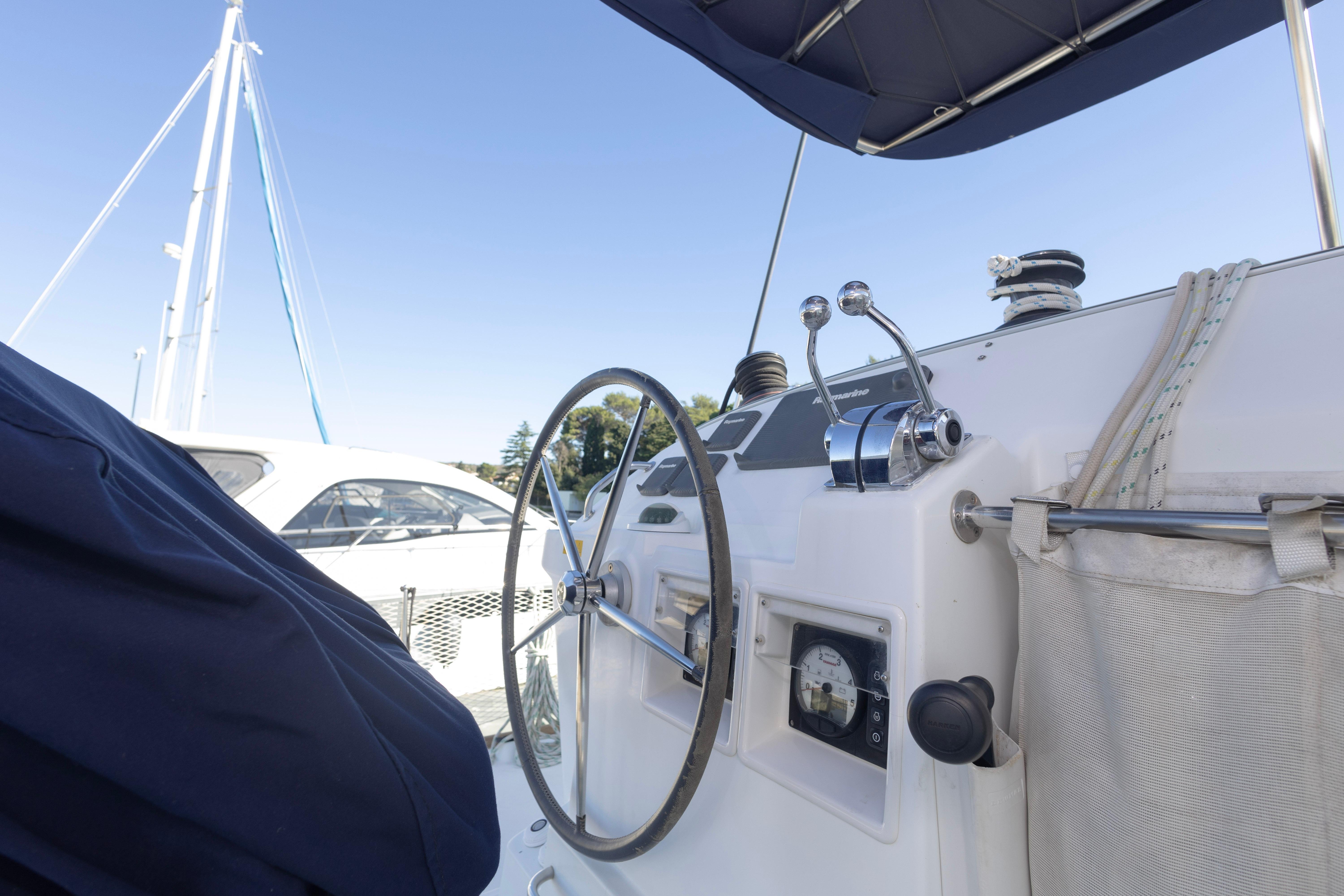 Recent upgrades include a complete Victron AGM house-battery bank with twin MPPT chargers, renewed electric toilets (new seats and pumps), new cockpit cushions, and an upgraded davit system that keeps the dinghy higher and clear of waves. A newly added Highfield aluminum tender paired with a RemigoOne 1500 W electric outboard (2025) offers quiet, emission-free operation a modern and efficient solution for short trips and anchoring.