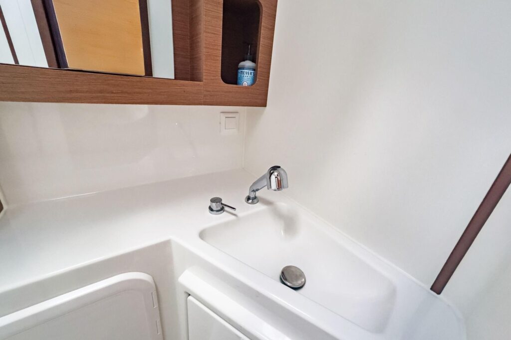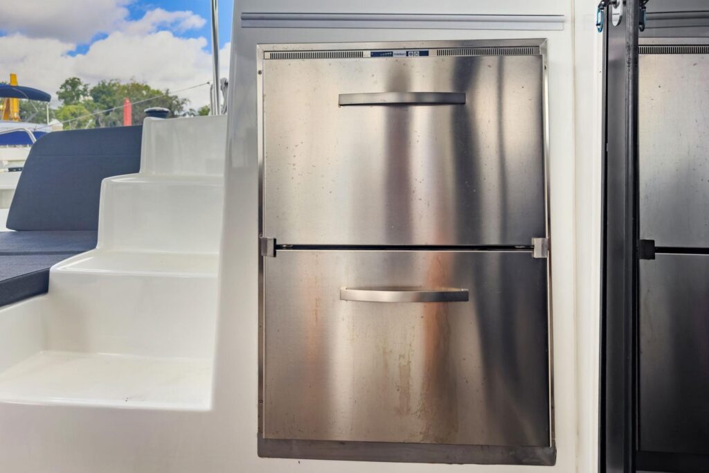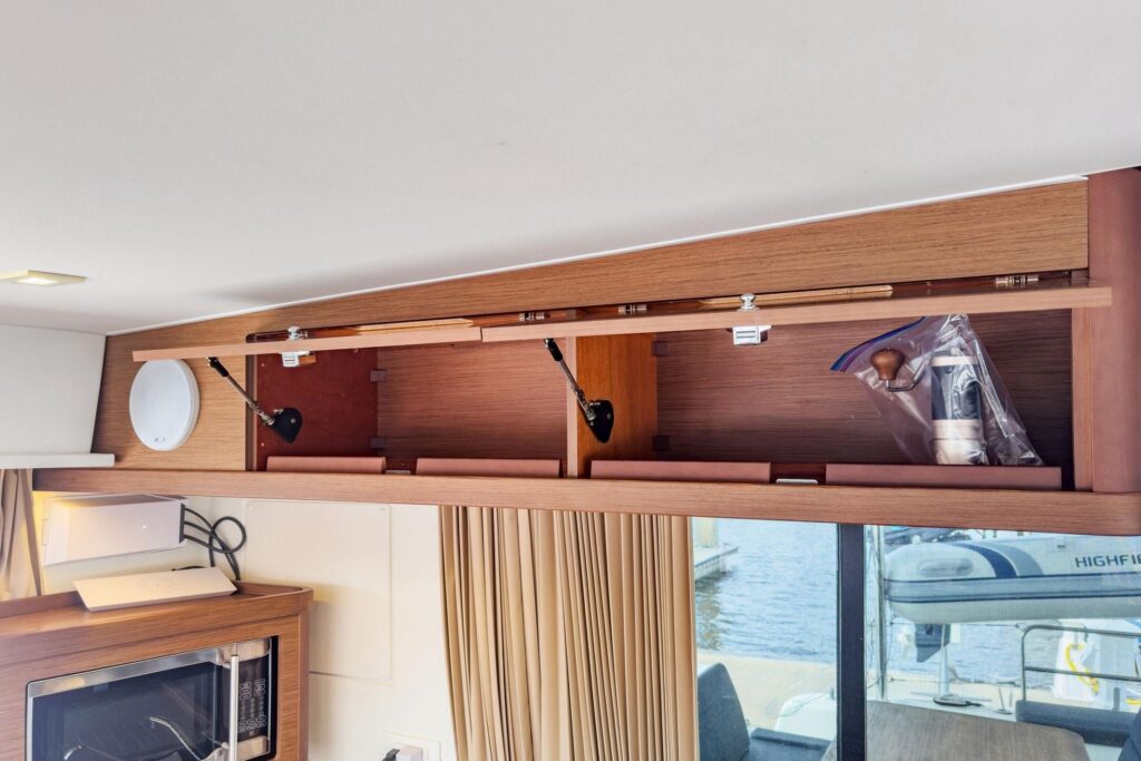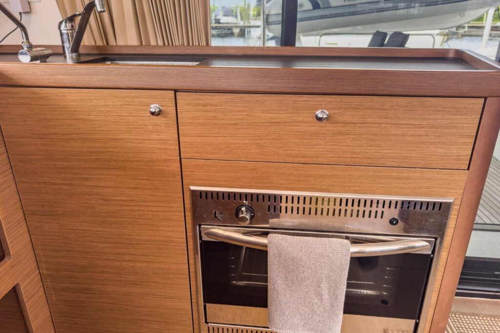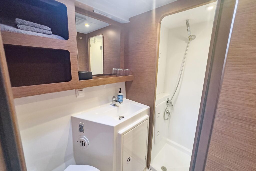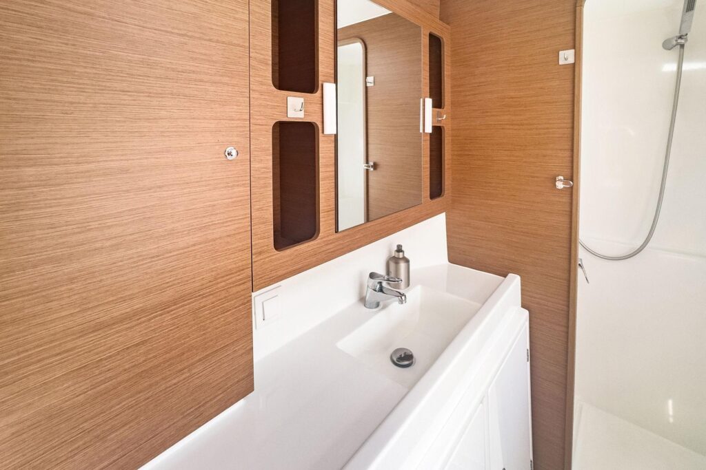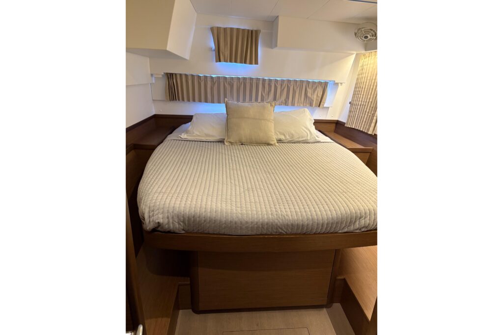3 cabins and what cabins! Island double beds for the aft cabins and beds with side access for the forward cabins, the aft cabins benefit from a bathroom with a separate shower, very large windows in the cabins offer excellent illumination and magnificent views of the surroundings, the vertical glazing in the coachroof provides saloon illumination: a well-lit, comfortable environment that is perfectly balanced between the galley and saloon areas, the U-shaped galley, fully fitted with broad work surfaces and extensive storage space, is oriented towards the external cockpit.