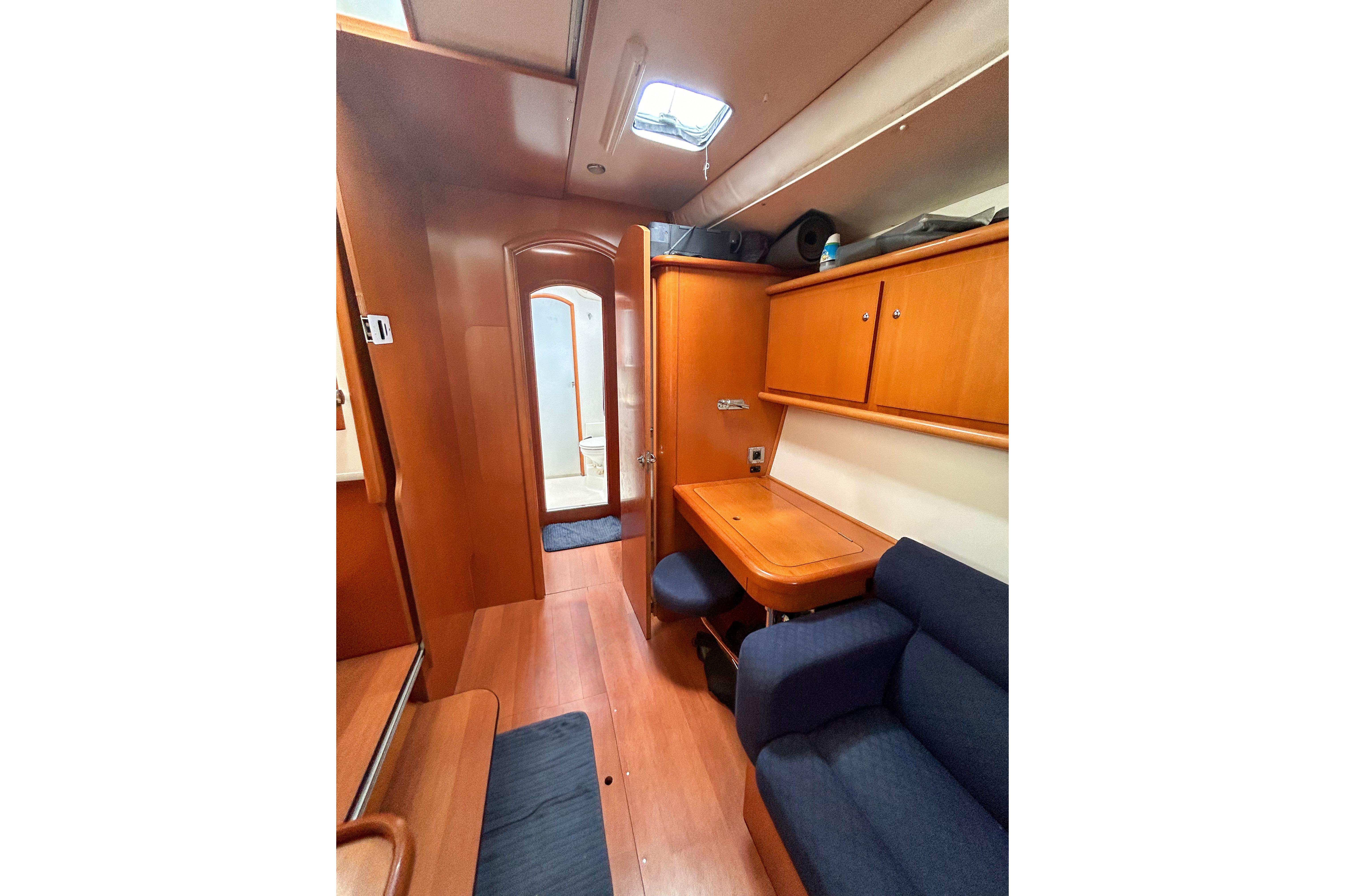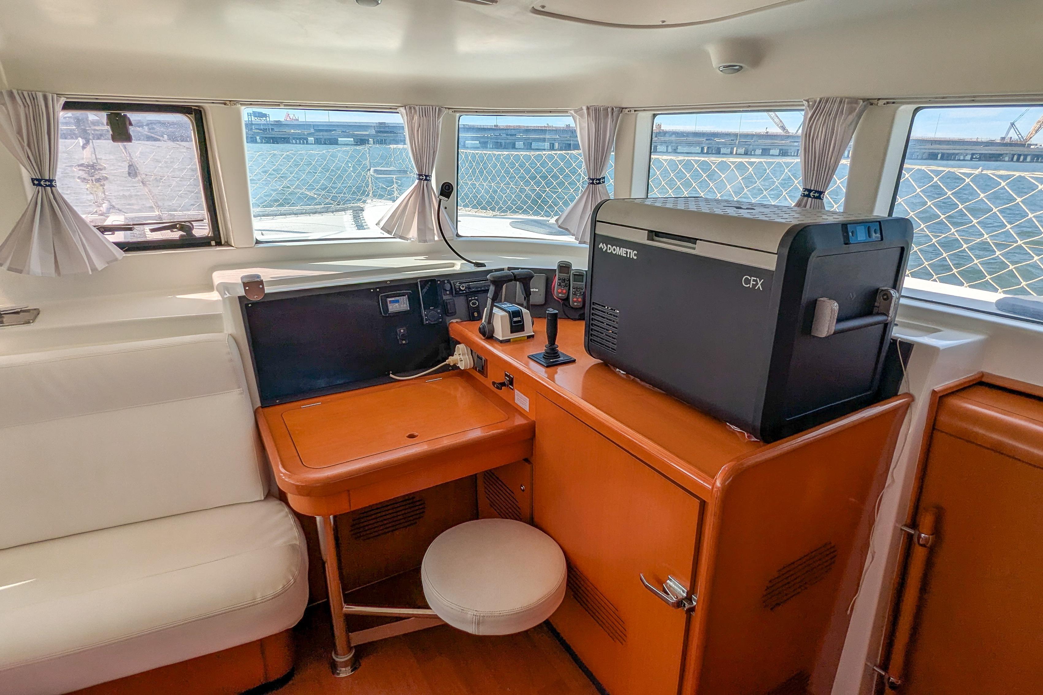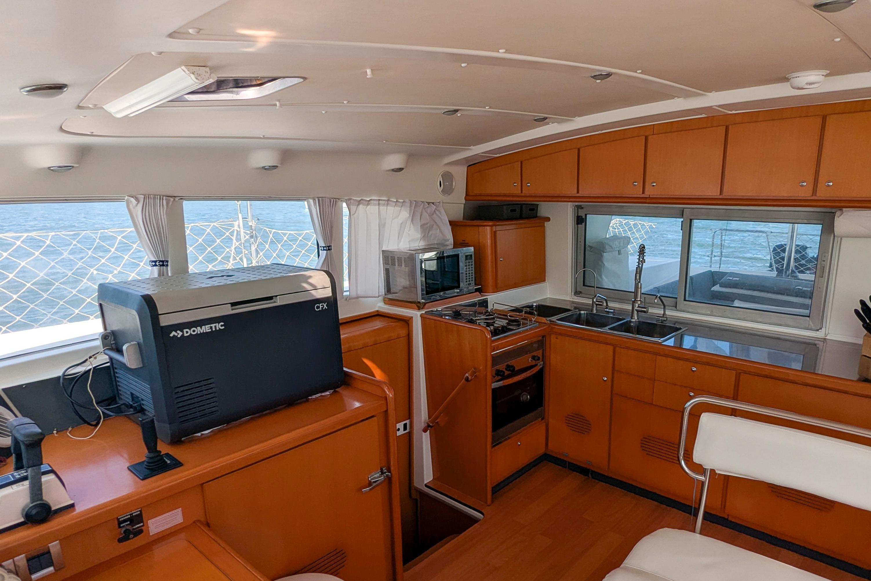 The cockpit and salon have two full size and one coffee table, which are interchangeable for optimal entertaining space. Additionally, it features a well-sized 12' AB ('22) for exploring.