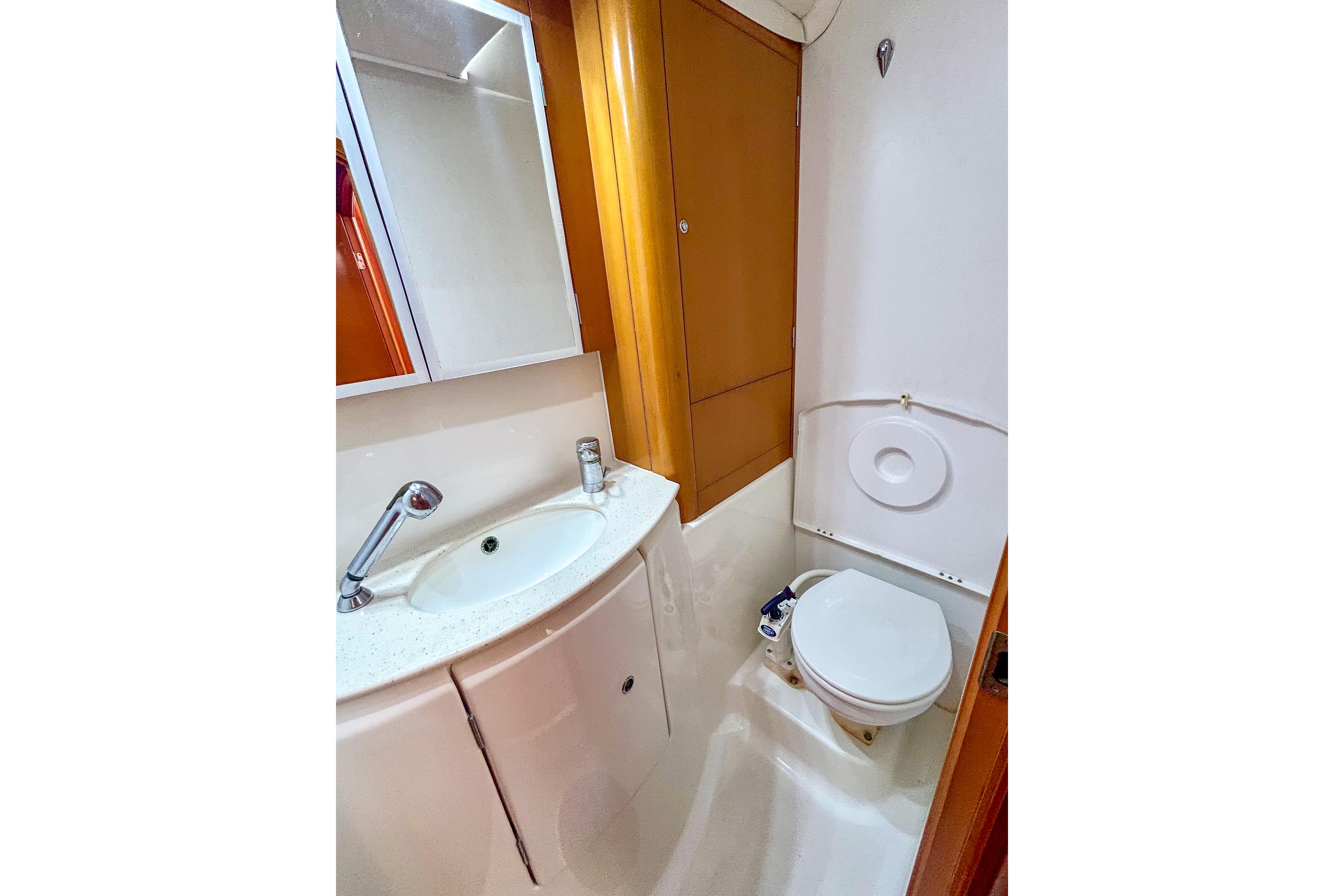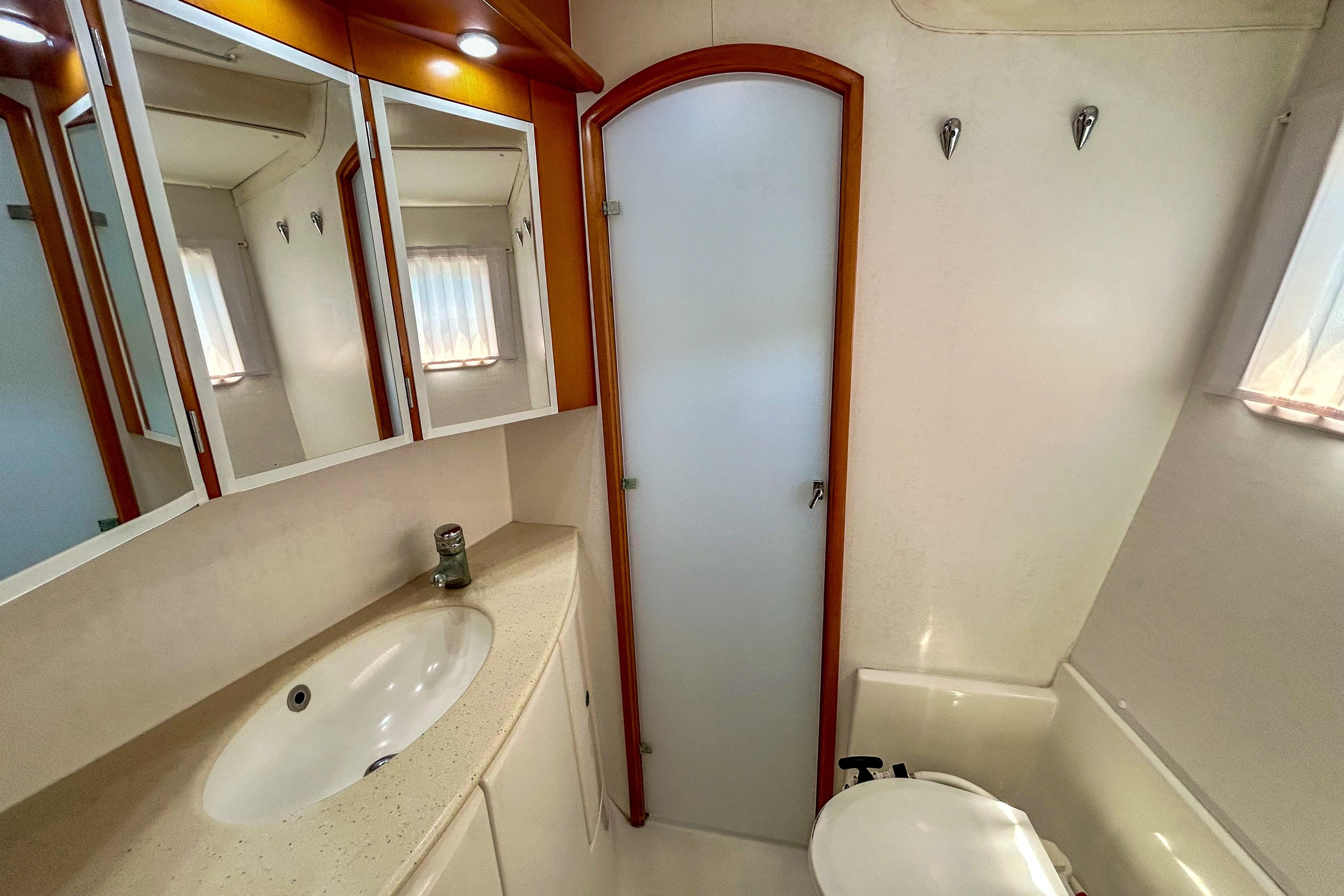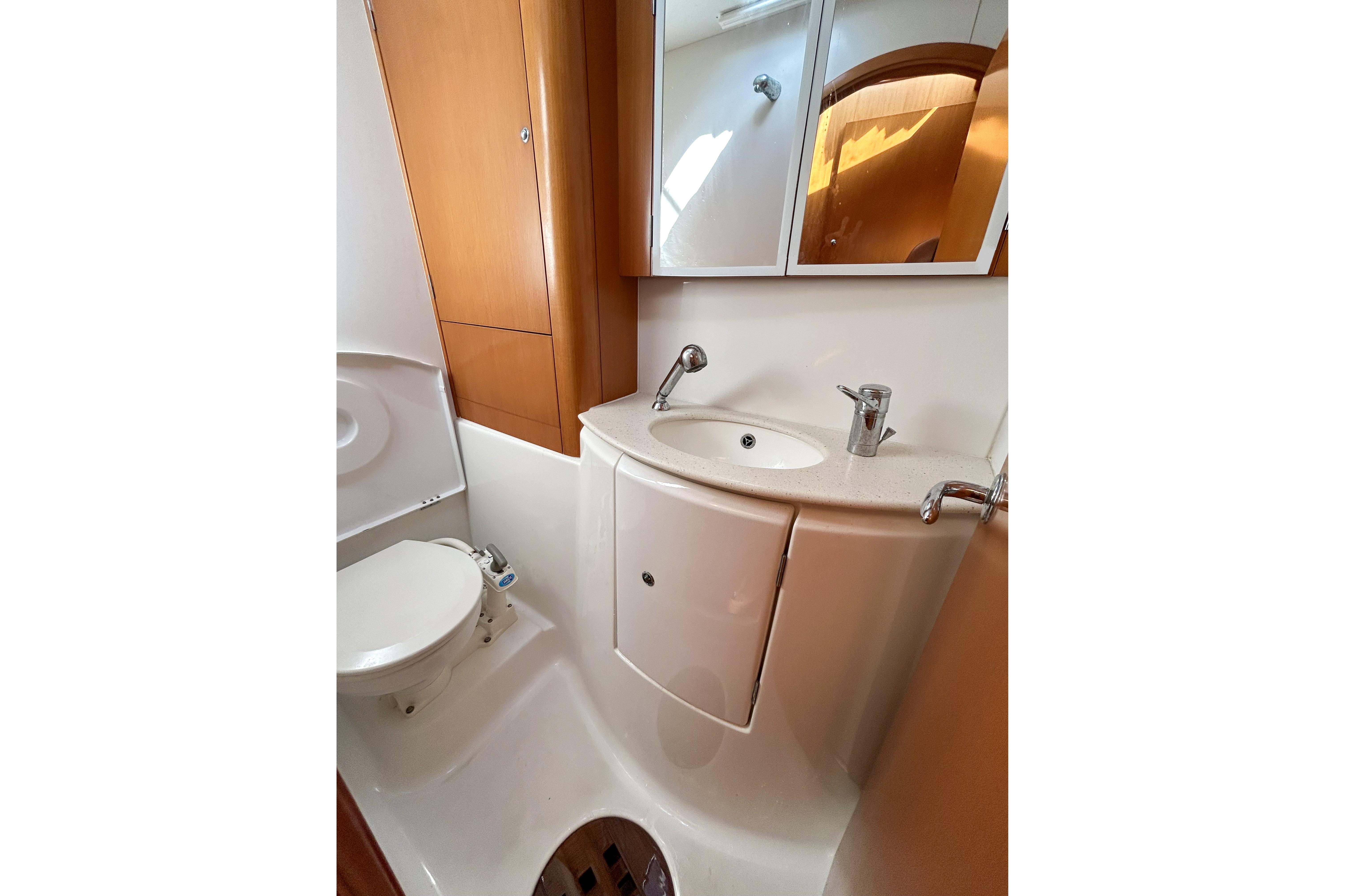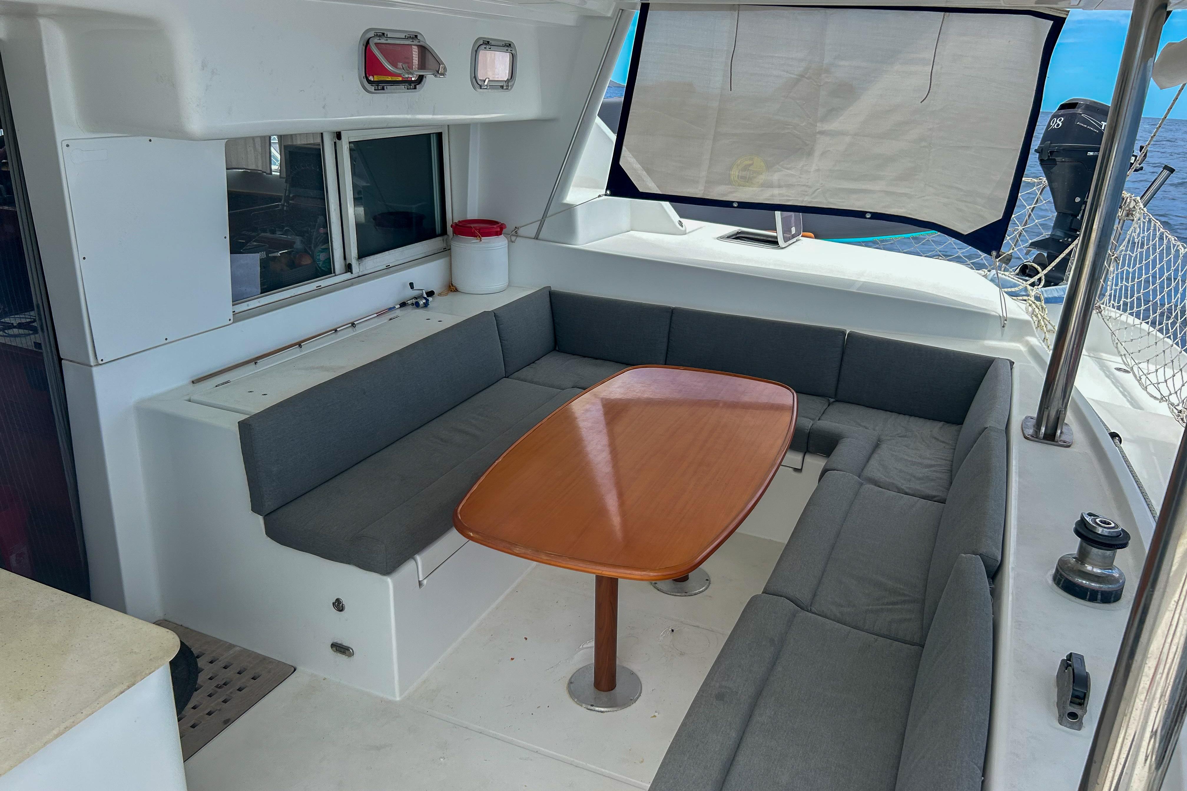 The cockpit and salon have two full size and one coffee table, which are interchangeable for optimal entertaining space. Additionally, it features a well-sized 12' AB ('22) for exploring.