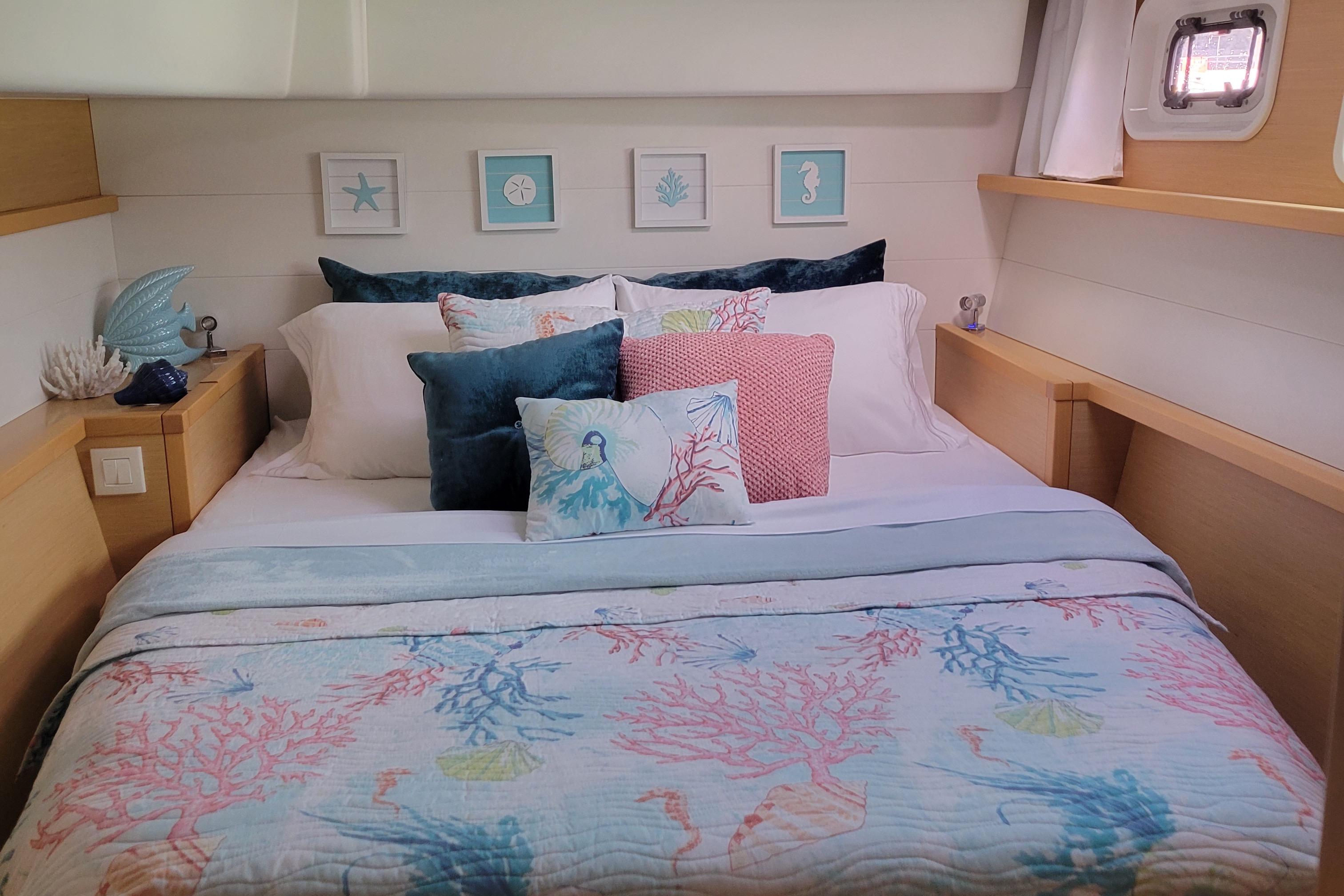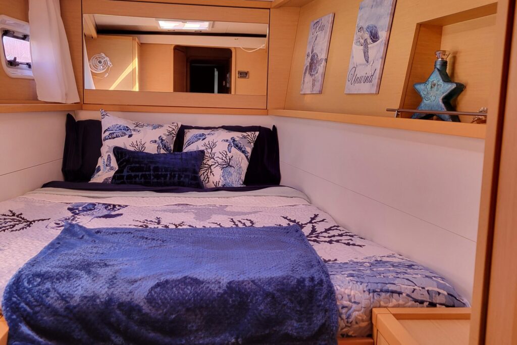 Owners cabin in the starboard hull, with queen size semi walk around bed, sofa, and large bathroom with a teak floor