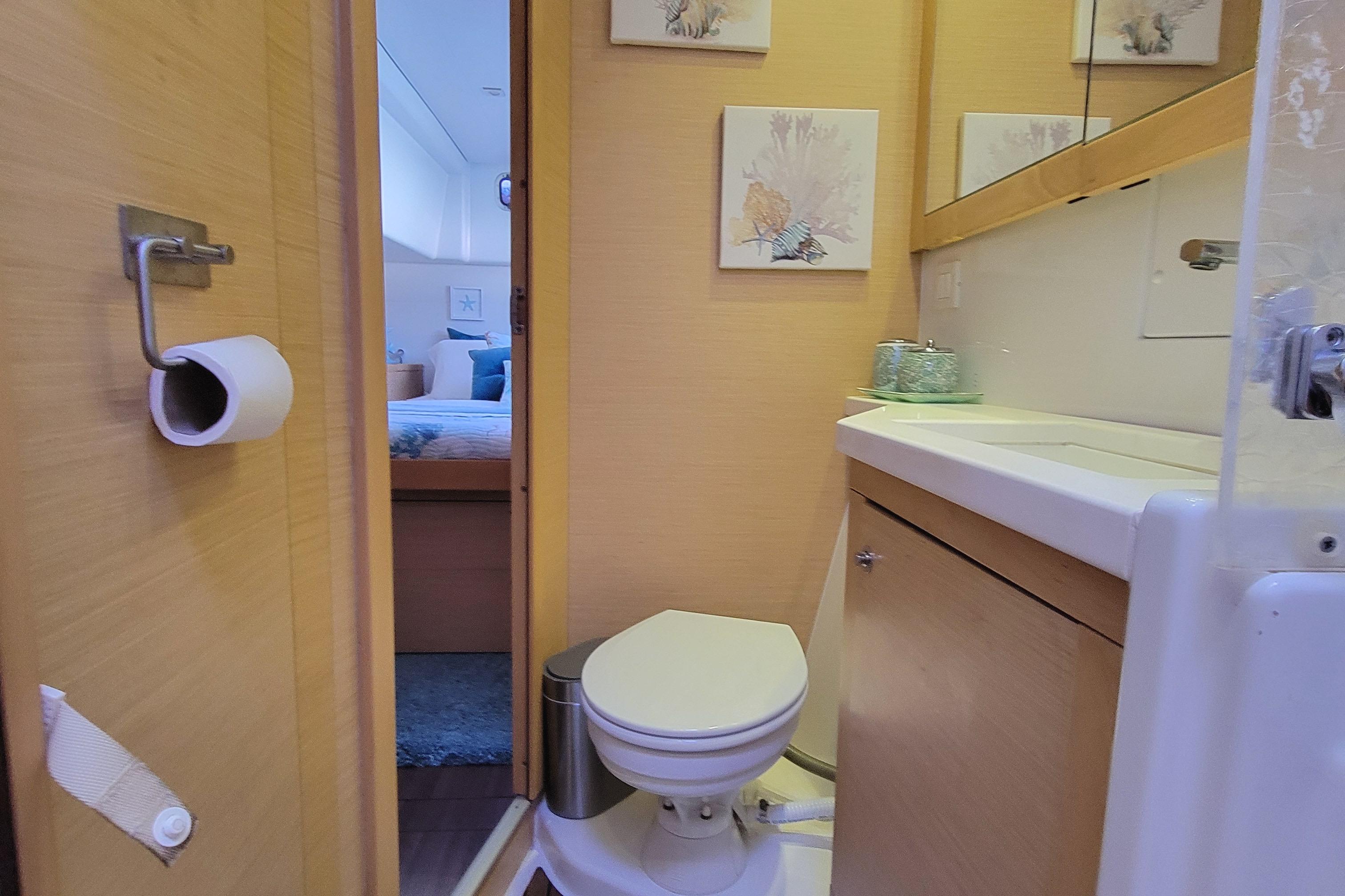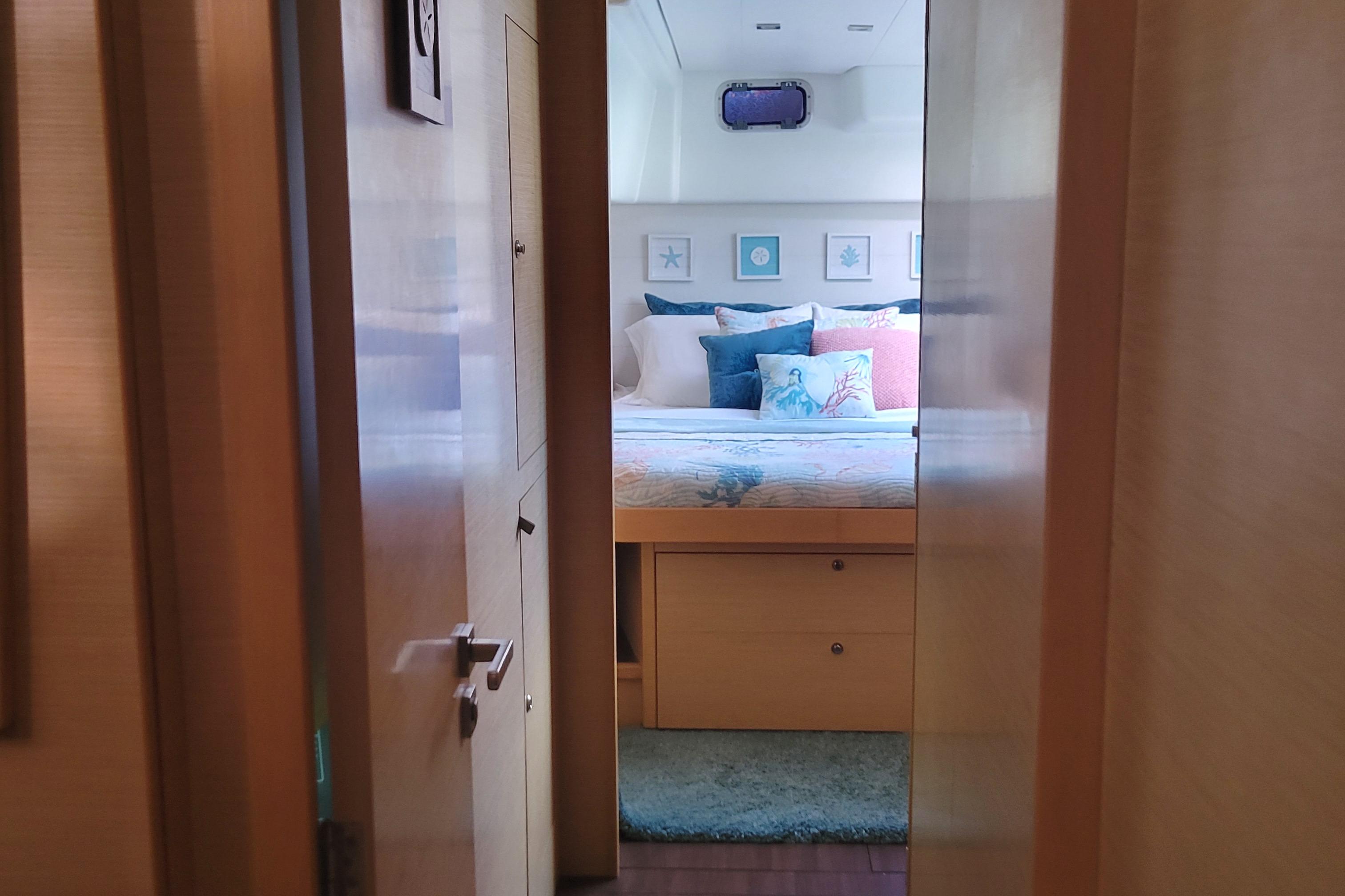 Guest cabins in the port hull, each with queen size bed and ensuite with electric heads separate showers