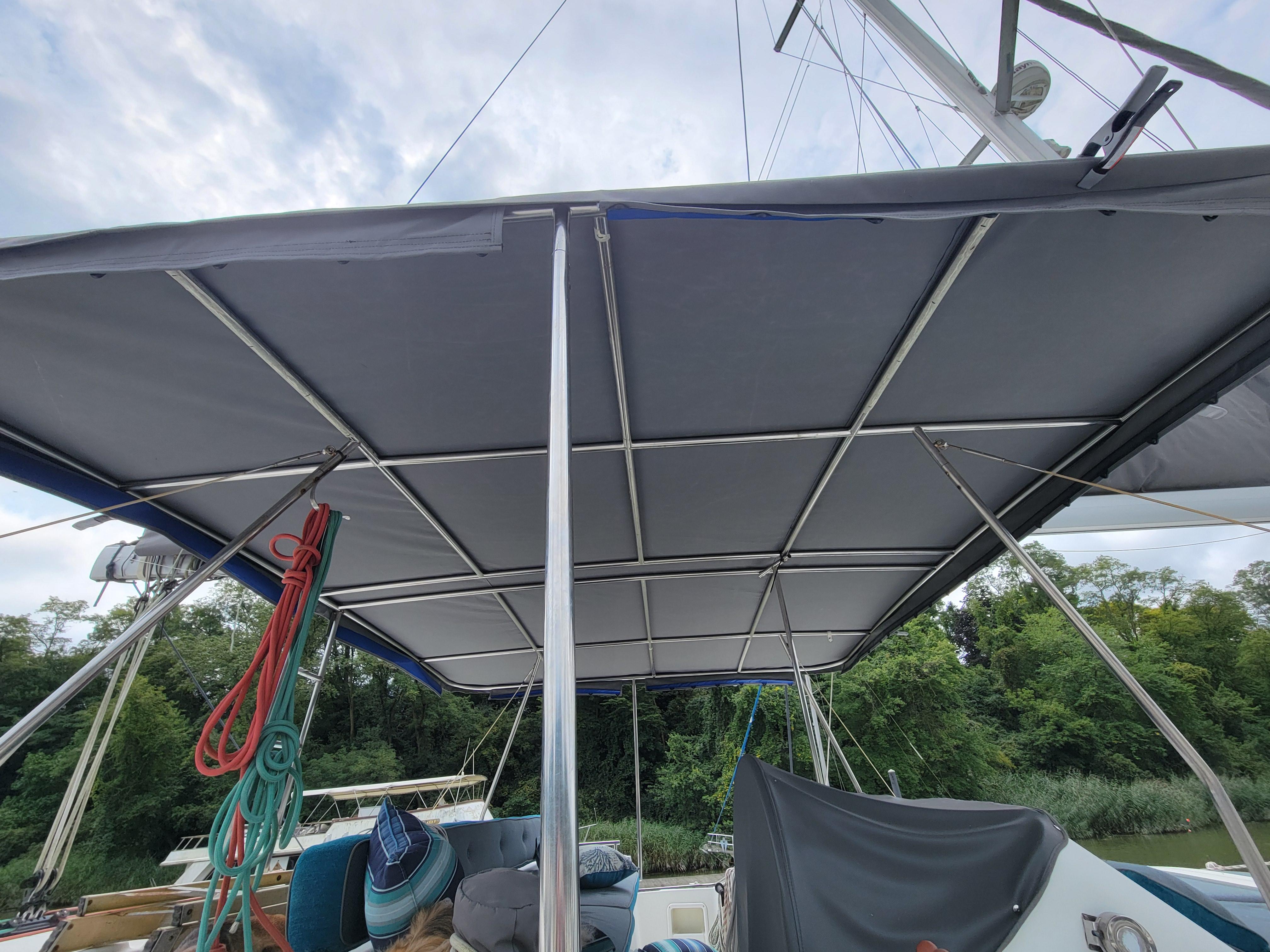 Large cockpit with teak soleprotected by fixed composite bimini with recessed cockpit lighting