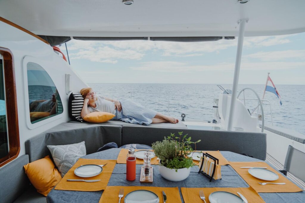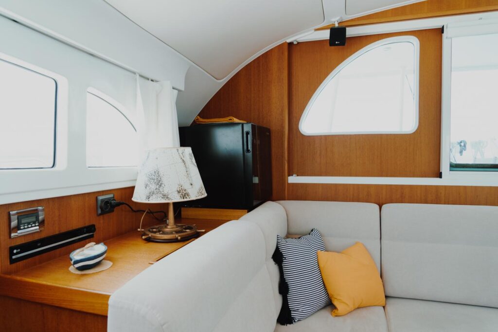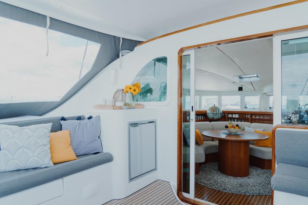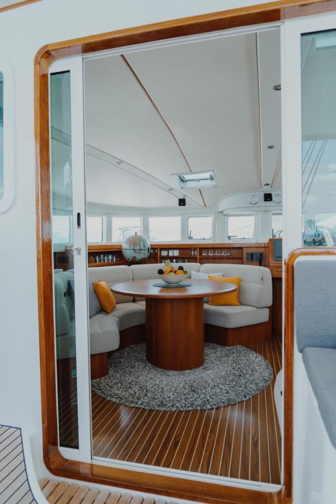 MALA offers a spacious portside galley-down layout, maximizing the main salon area for socializing and relaxation. Large windows flood the interior with natural light creating a warm and inviting atmosphere.