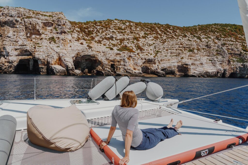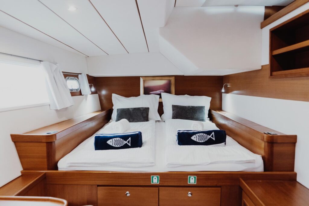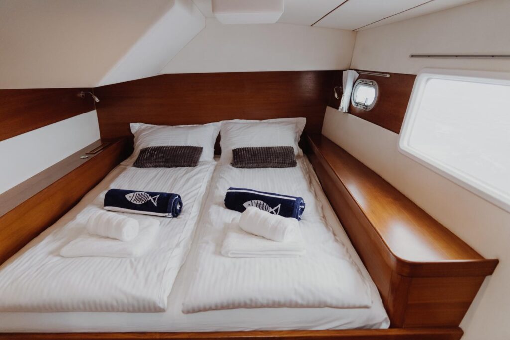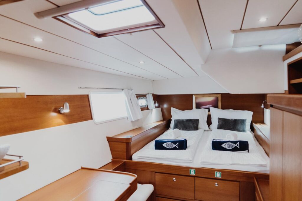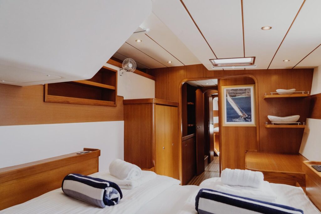 MALA offers a spacious portside galley-down layout, maximizing the main salon area for socializing and relaxation. Large windows flood the interior with natural light creating a warm and inviting atmosphere.