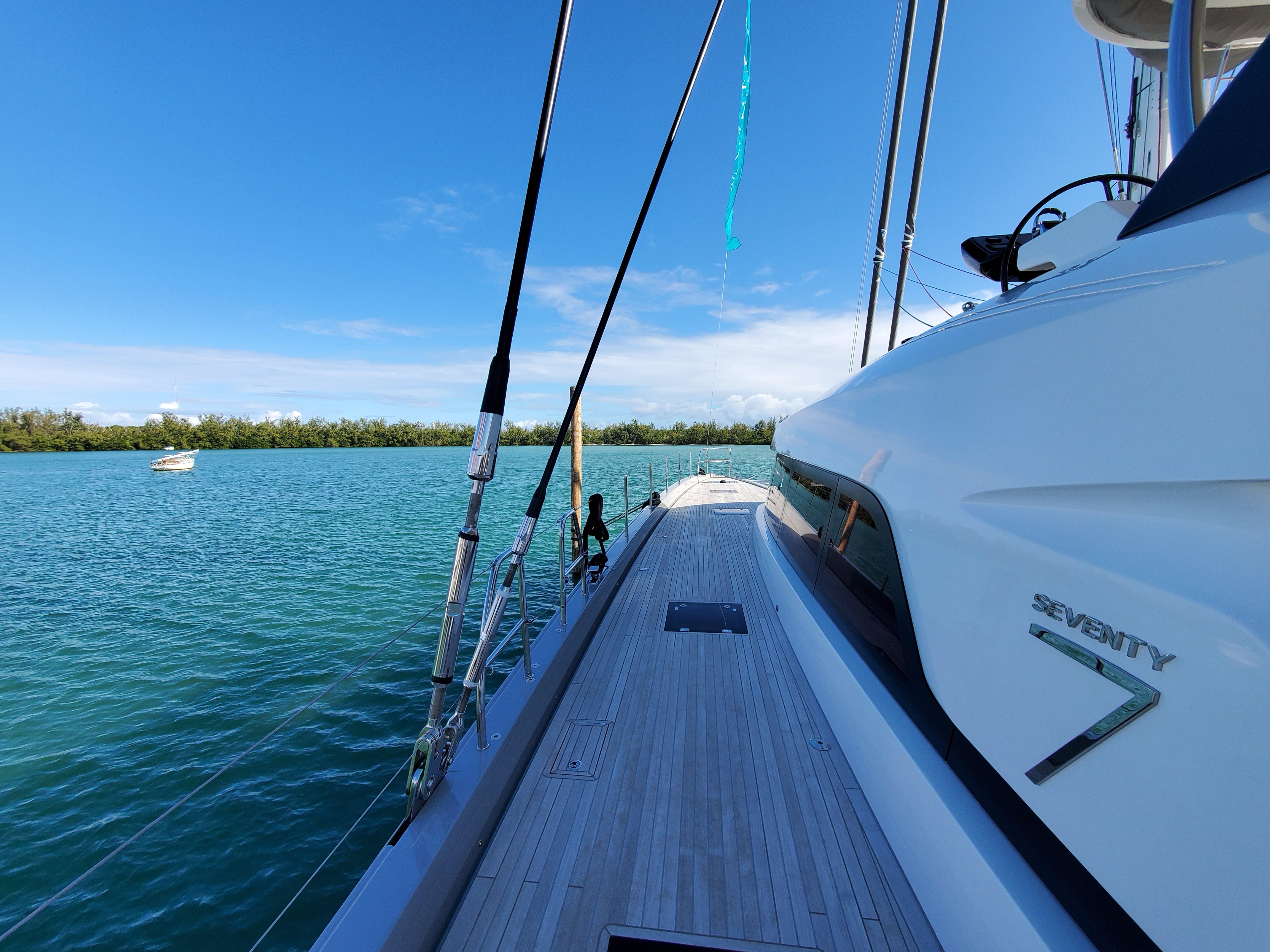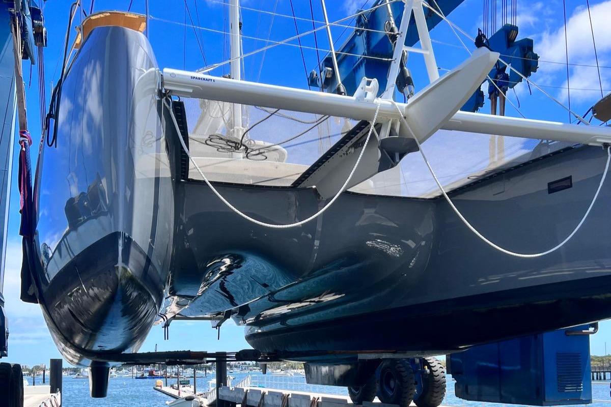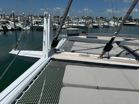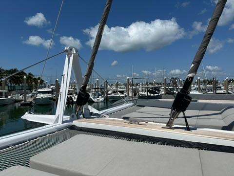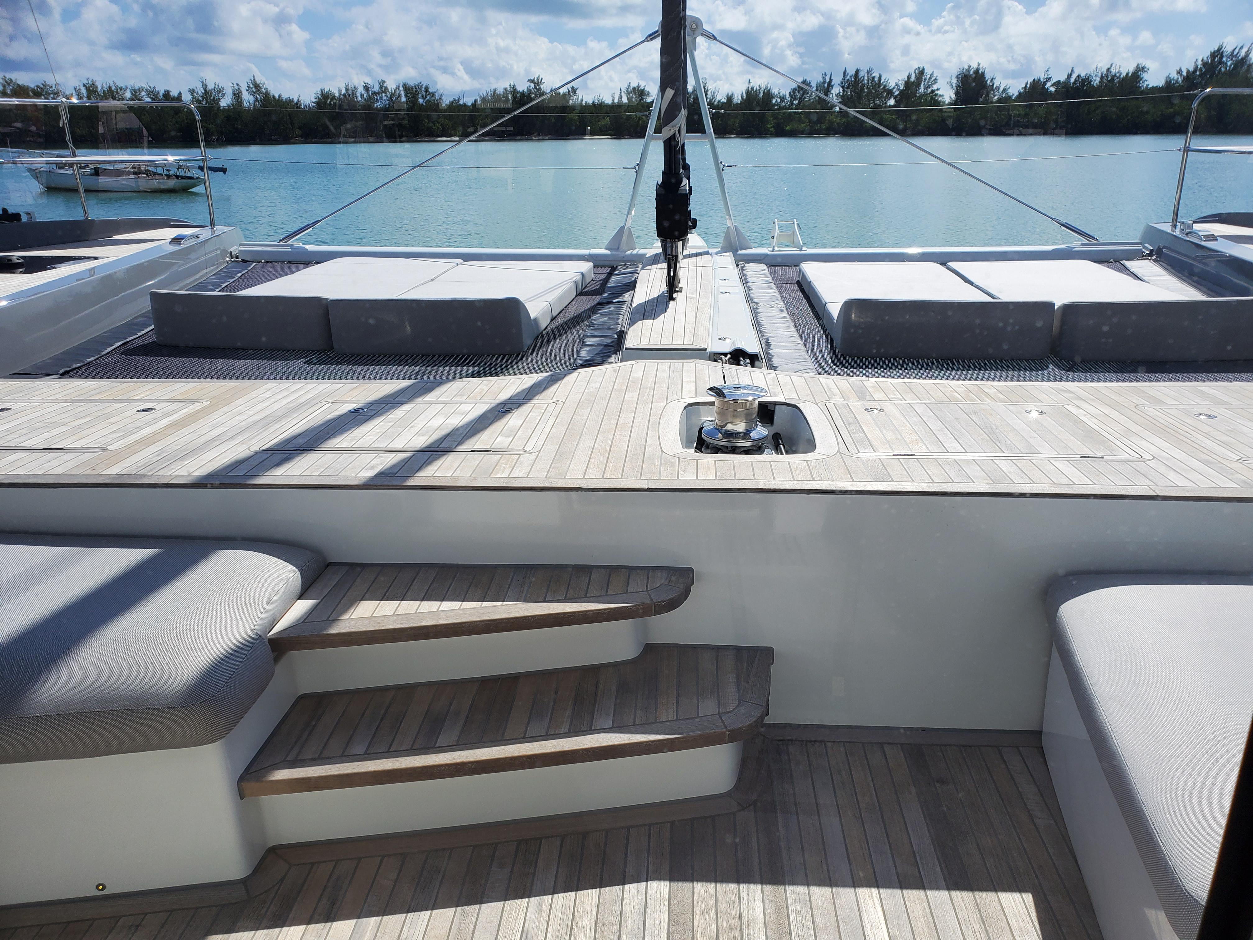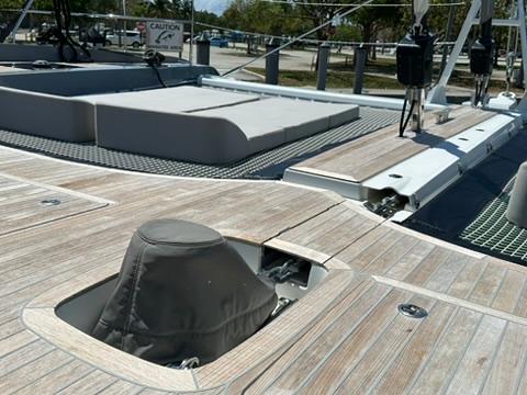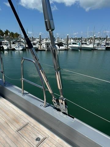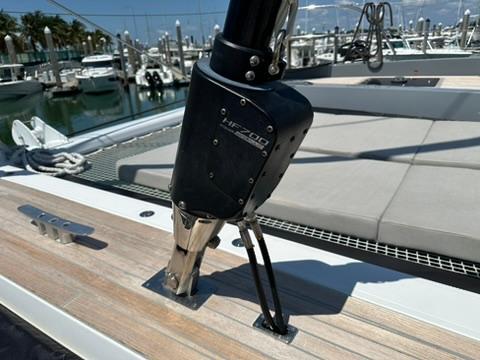- White-painted aluminum crossbeam with genoa furler chain plate and anchor davit