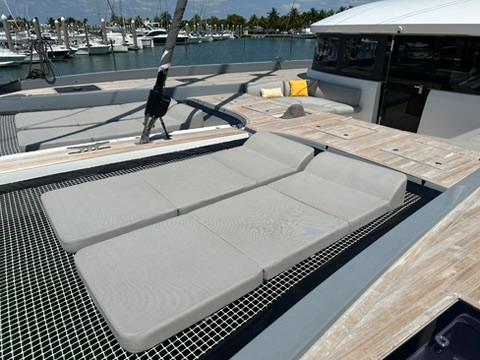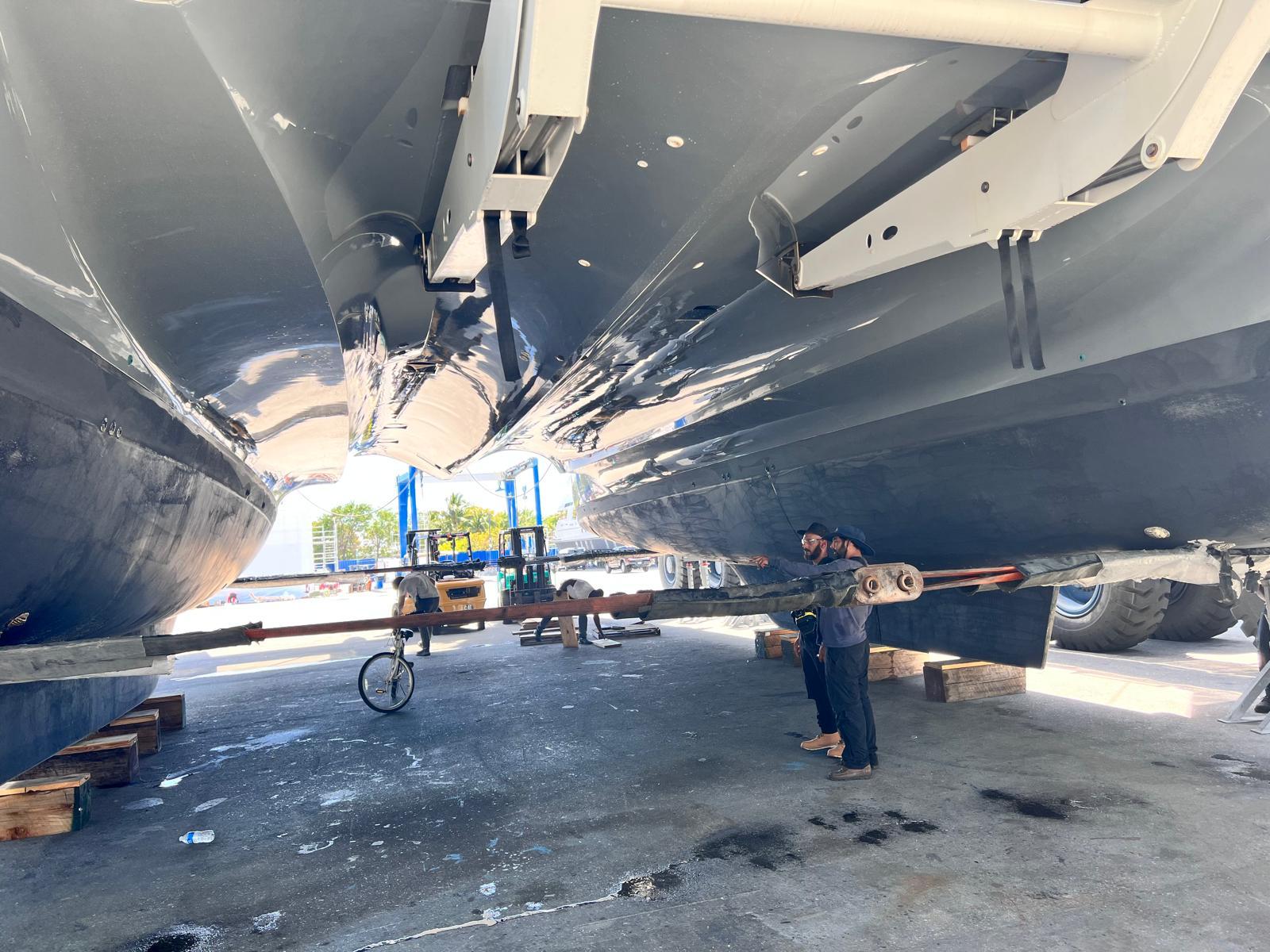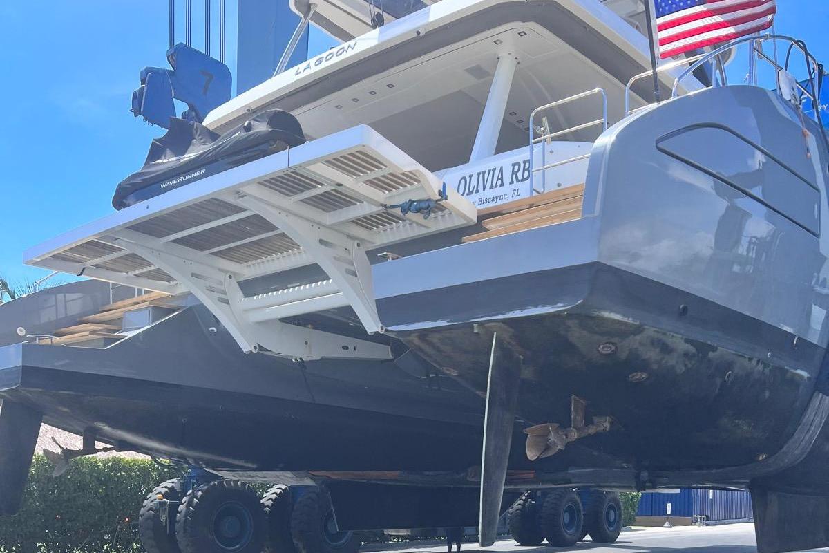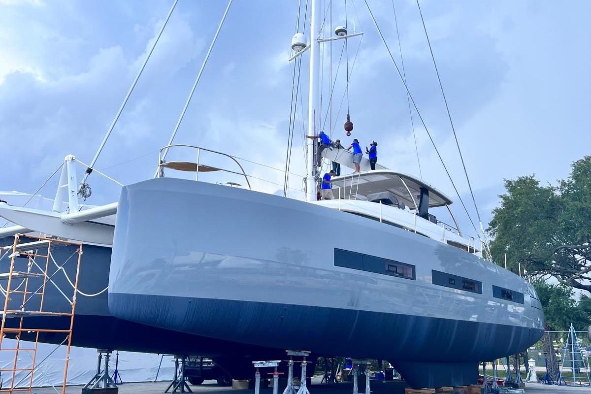 - White-painted aluminum crossbeam with genoa furler chain plate and anchor davit