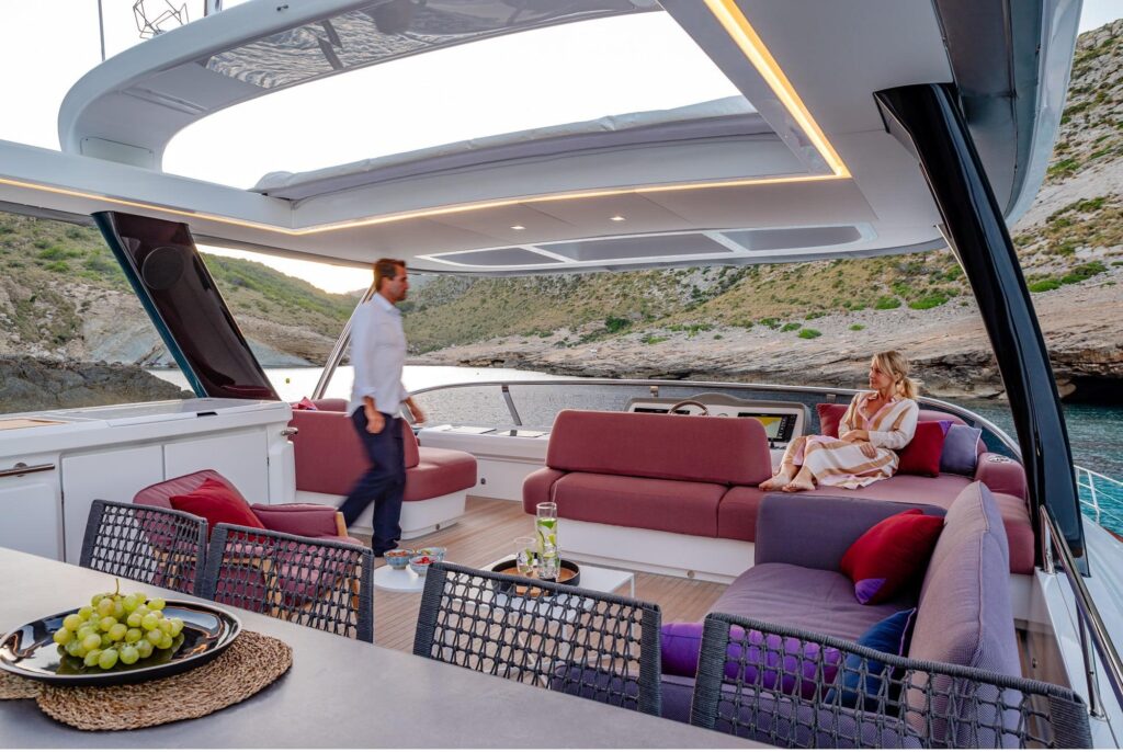 Discover the flybridge, where everything has been designed for you to feel free. Open to the natural environment for a stunning view, the versatile layout will meet your every expectation.