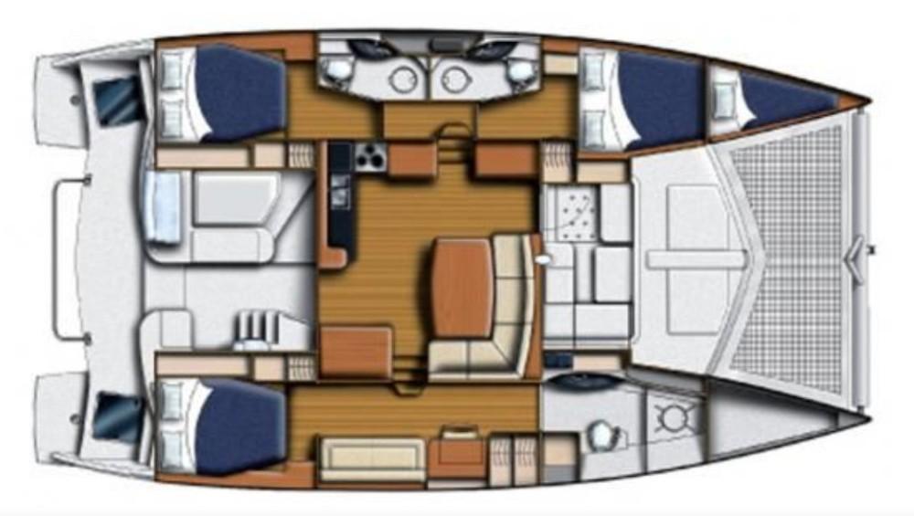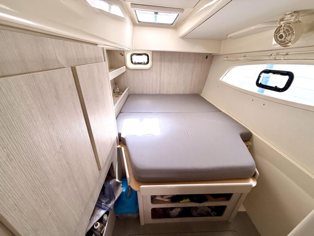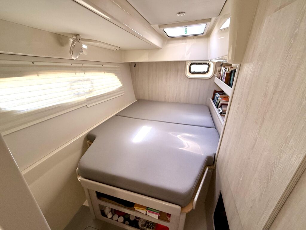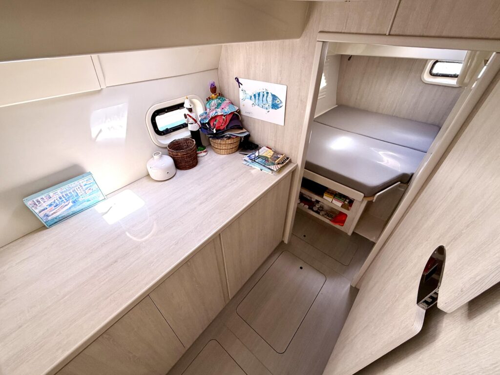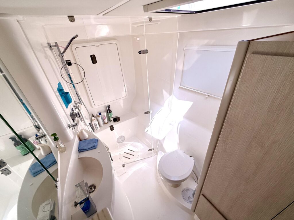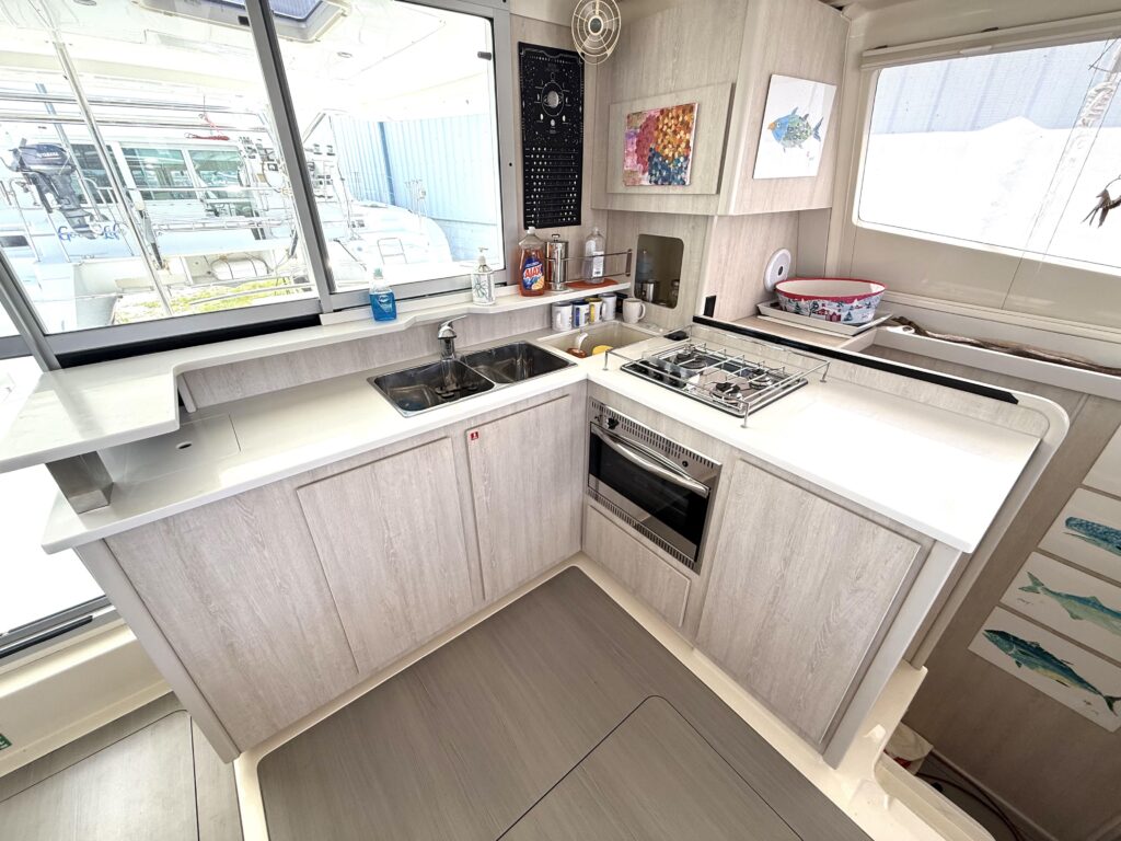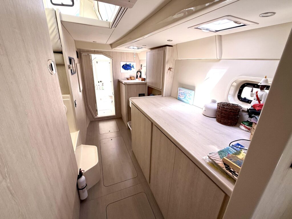 Inside Diastema, the Leopard 44s signature light and airy design shines through, with wraparound panoramic windows, generous headroom, and a bright, open-plan salon that feels spacious and inviting. The main living area features a comfortable settee and dining table, seamlessly connected to a practical, well-equipped galley with ample counter space and clever storage throughout. The unique forward cockpit access keeps fresh air flowing and enhances the connection between indoor and outdoor spaces. The starboard hull is dedicated to a private owners suite with a queen berth, abundant storage, and a large ensuite head with a separate shower, while the port hull provides two cozy guest cabins and a shared head, making Diastemas interior feel like a true floating home, perfect for liveaboard life or extended cruising.