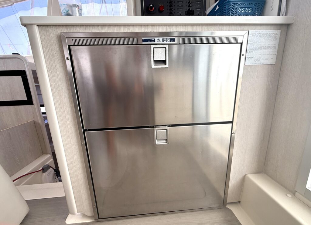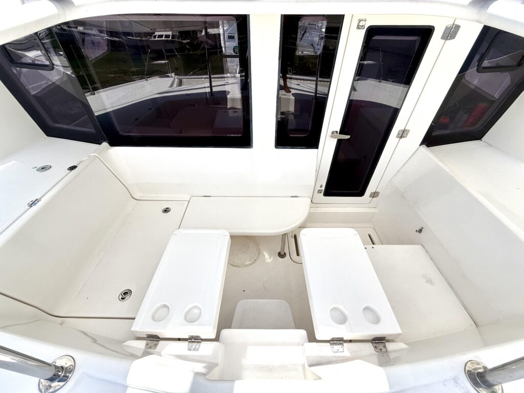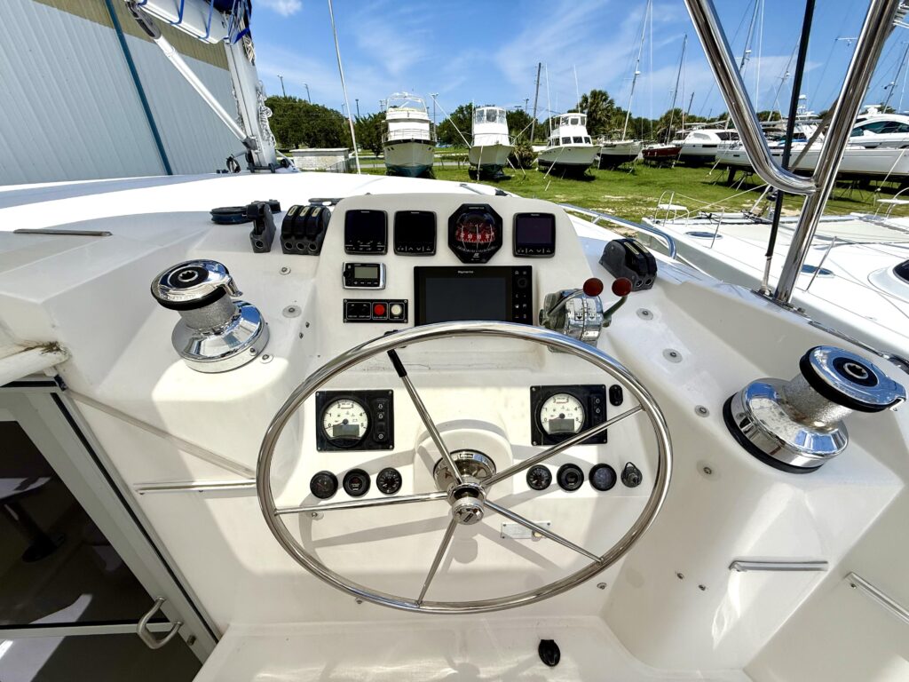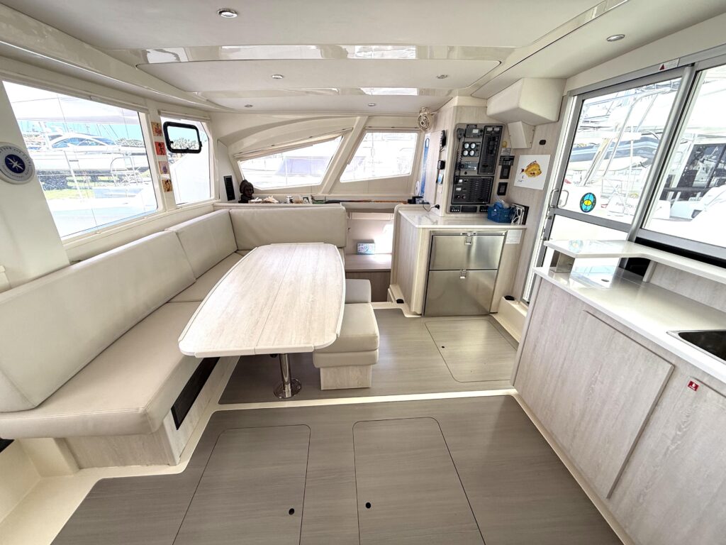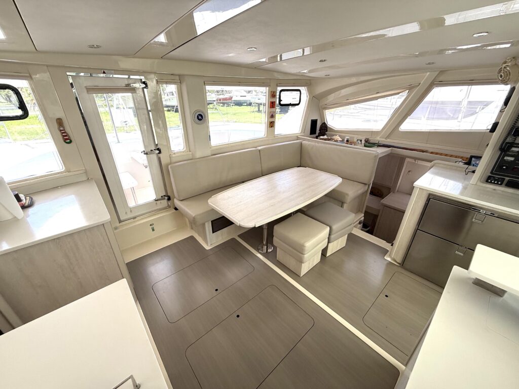 This 3-cabin owners version has been lovingly maintained and shows true pride of ownership throughout. The moment you step into the bright, open salon, youre greeted by panoramic windows that flood the space with natural light, creating an airy and spacious feel that sets her apart from other cats in her class. The galley is smartly laid out with ample storage, and the comfortable settee invites you to relax and take in the views at anchor or underway. Her spacious outdoor living areas, including the forward cockpit and the large aft cockpit, offer ample room for entertaining, lounging, or simply enjoying life at sea.
