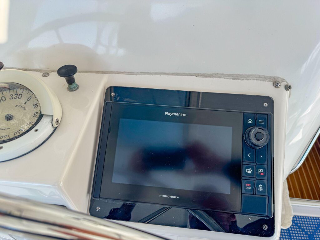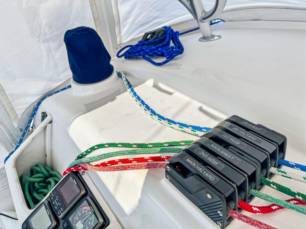 Harken 42 two-speed self-tailing winch in cockpit, 12 volt.Harken 50 two speed winch in cockpit