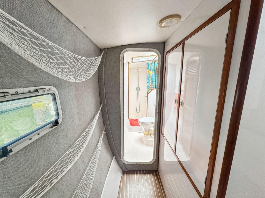 A Guest Head isshared and a built-in bookcase lines the companionway.