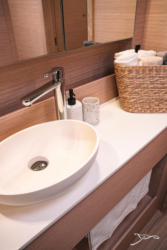 Pressurized water system with 5L expansion tank located on portside under floorboard at mast bulkhead
