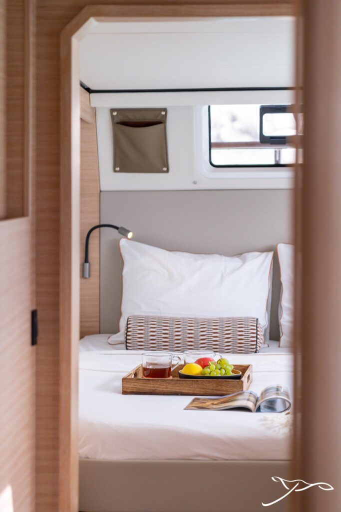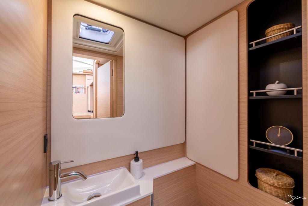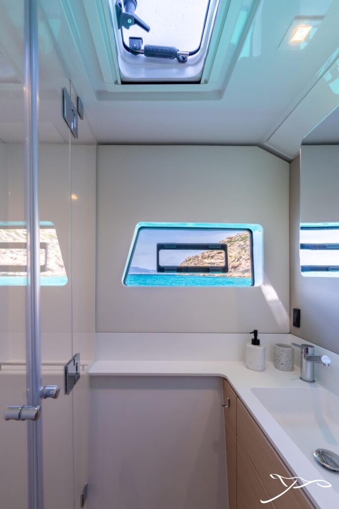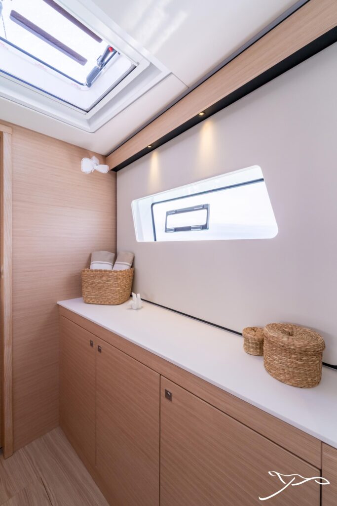 • 1 large glazing at the headboard in the aft cabin with integrated flush opening porthole