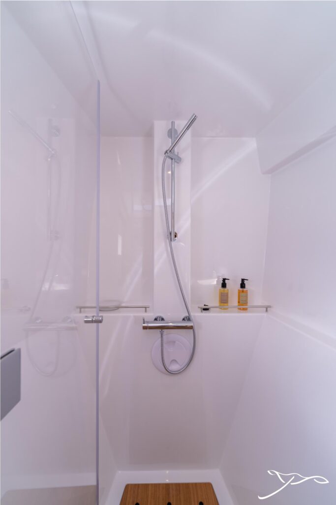 An ideal position to have an unobstructed view of the sails and the sea whatever the speed, but also to keep an eye on the crew members in order to sail in complete safety. Centralized maneuvers at the stern to maintain the link with the crew and the conviviality in navigation. Thanks to a shorter steering circuit, the reactivation of the bar will be amplified offering a pleasure at the helm without comparison.