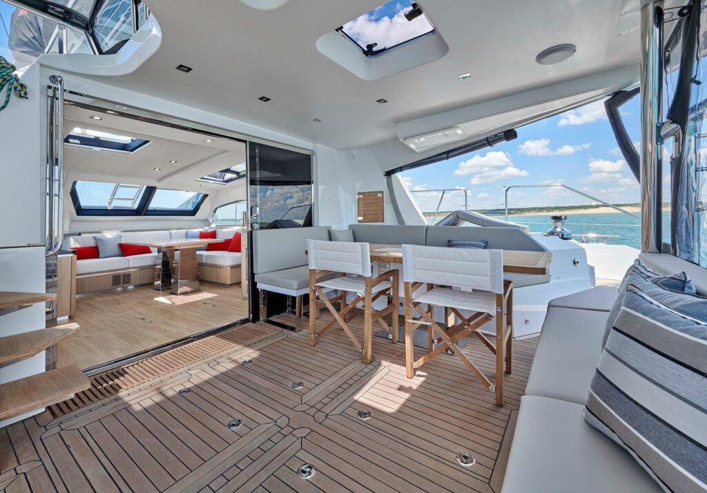 All Weather Protection - All-weather protection is fundamental to extended cruising. The Privilge Signature 510 helm features a hard dodger and full enclosure. The fact that the 510 can be sailed without leaving the helm is a great benefit while sailing in cold weather. The large cockpit is protected by a hardtop that extends right back to the aft platform. Once the full enclosure is lowered, a large, comfortable weatherproof living area is created that connects beautifully to the salon.