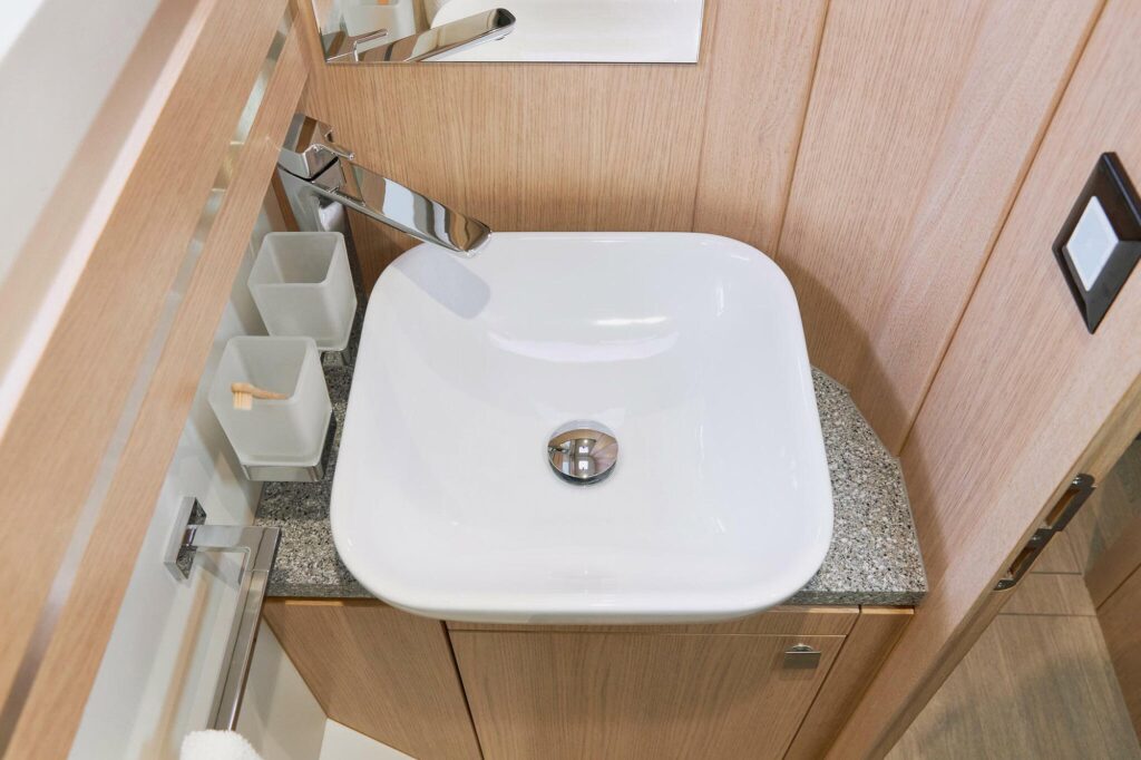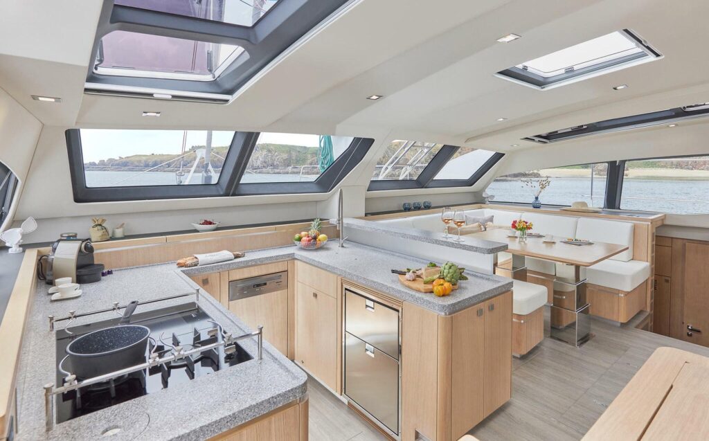 Storage Capacity -Storage capacity is essential for extended time aboard. A dedicated wardrobe in the master suite, a floor to ceiling pantry and large capacity fridge and freezer in addition to a well-appointed galley with plenty of cupboards and counter space are just a start. Also as important are spaces to store wet or bulky items such as fenders and additional sails. Theres also a dedicated location for an easy to deploy life raft in the cockpit that doesnt interfere with the flow of movement.
