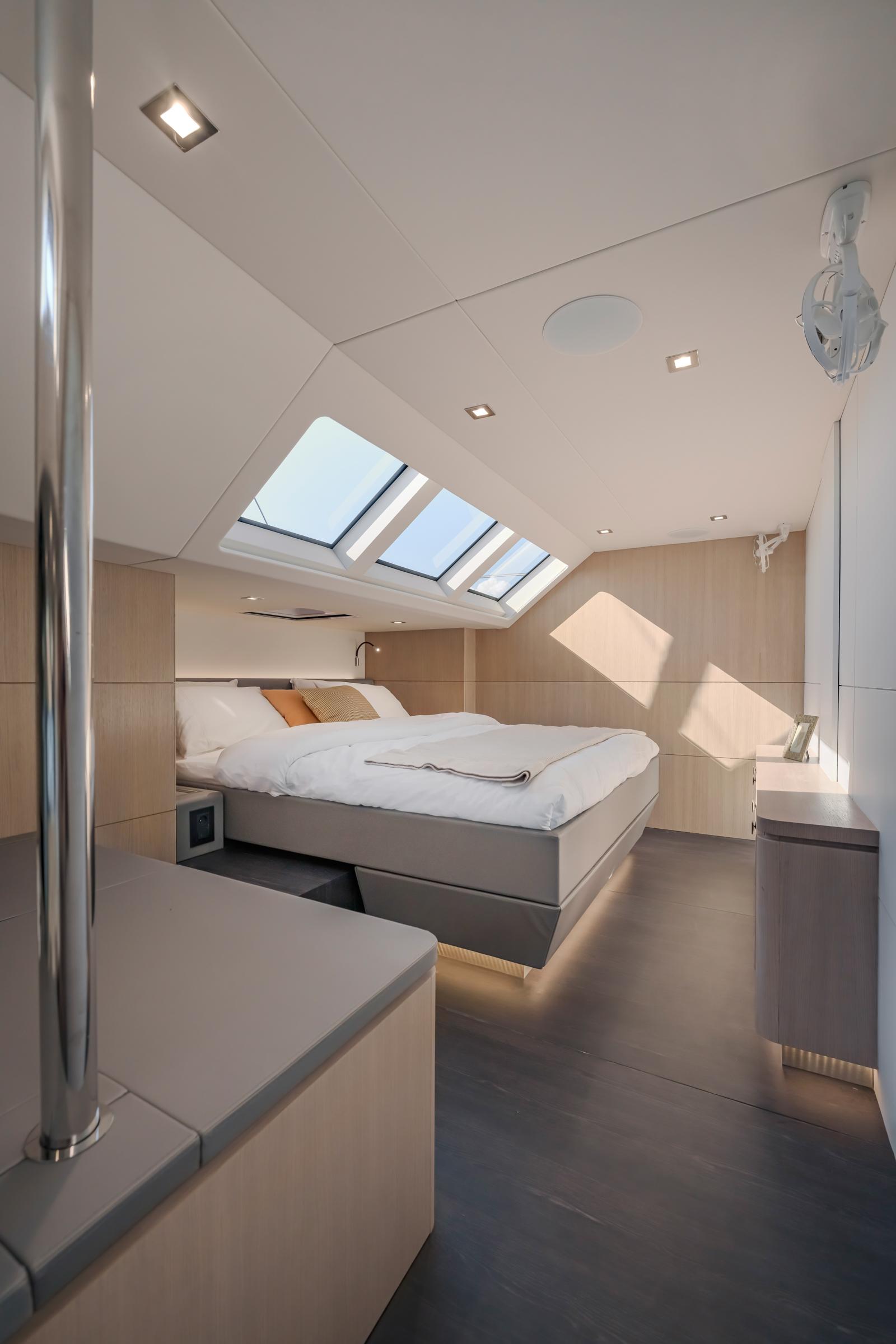 An additional side window to port and a large forward-facing panoramic window above the king-size bed provide maximum natural light in the master suite. The headroom has been raised to just over 6.5 feet, so that even tall sailors will find a comfortable space. The ensuite bathroom can be set up in the port bow to create additional space for storage and a sofa, or more centrally in the compact version of the master suite.